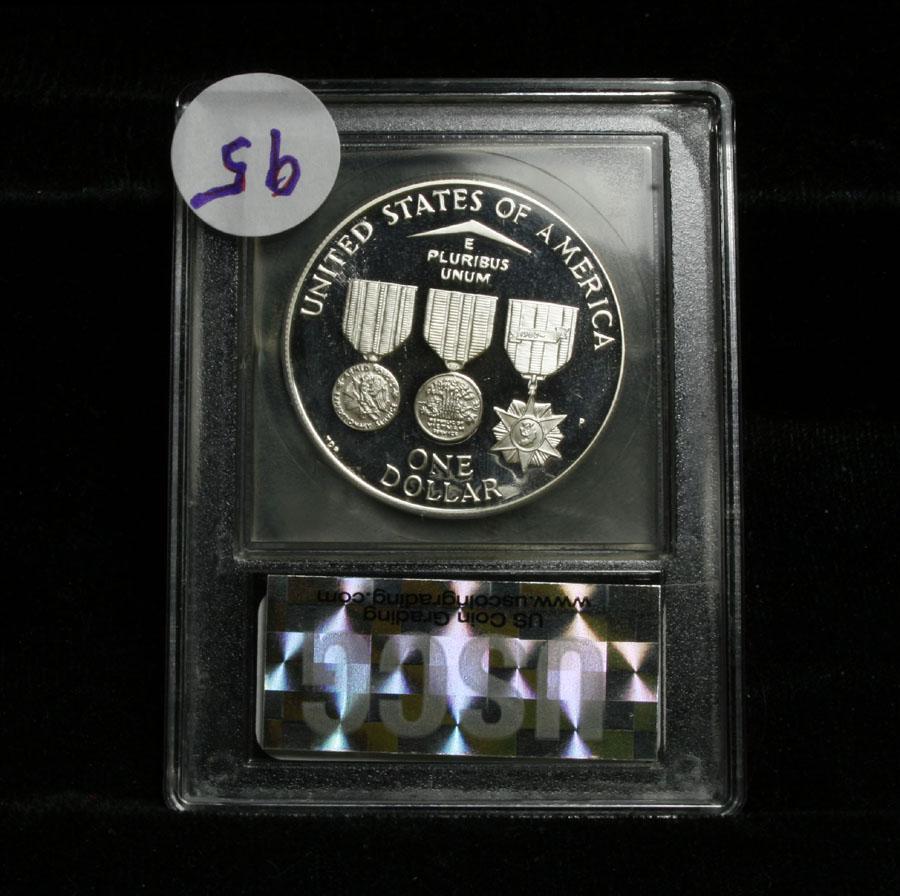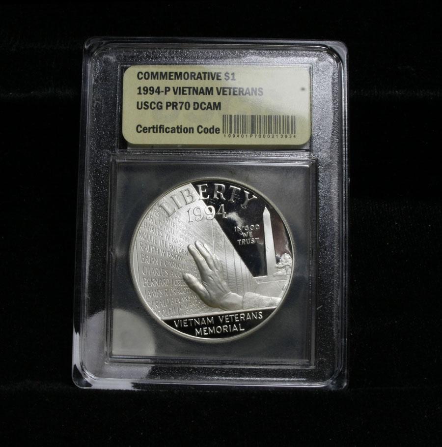 The 1994 Vietnam Veterans Memorial Silver Dollar was issued to mark the 10th anniversary of the dedication of the Vietnam Veterans Memorial Wall in Washington, DC. PCGS lists PR70 DCAM at $1700. This coin is graded PR70 DCAM by USCG. Estimated Value $500
