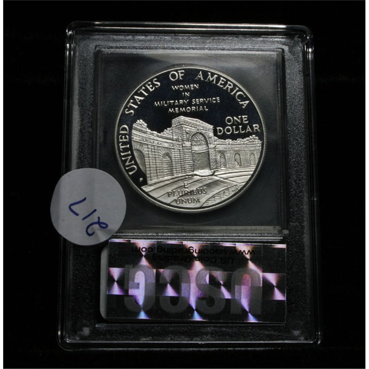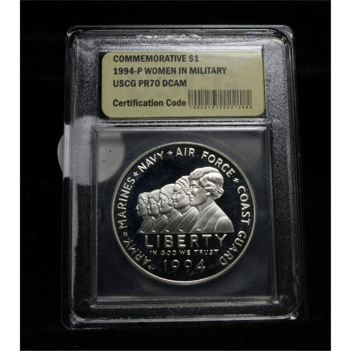 The 1994 Women in Military Service Memorial Silver Dollar was issued for the construction of a new memorial complex for women in military service. PCGS lists PR70 DCAM at $2800, very scarce. This coin is graded PR70 DCAM by USCG. Estimated Value $500