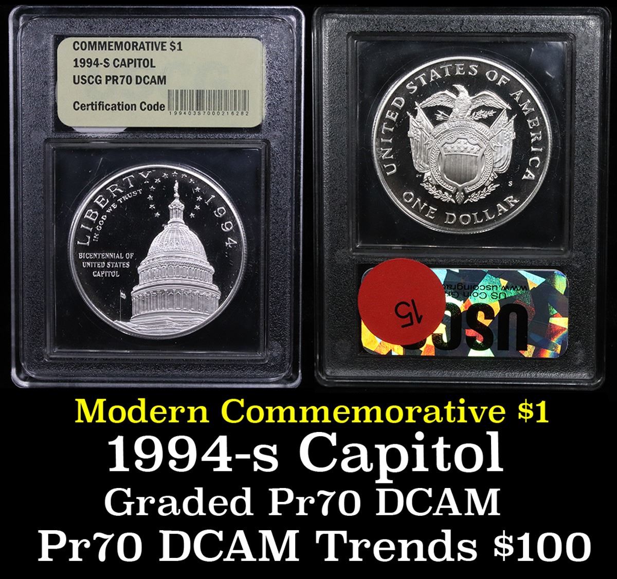 1994-s Capitol . . Modern Commem Dollar $1 Grades GEM++ Proof Deep Cameo. The 1994 Capitol Bicentennial Silver Dollar was for the 200th anniversary of the U.S. Capitol building in Washington DC. This Proof Silver dollar is graded Perfection PR70 by USCG. PCGS lists PR70 at $500. Estimated Value $200