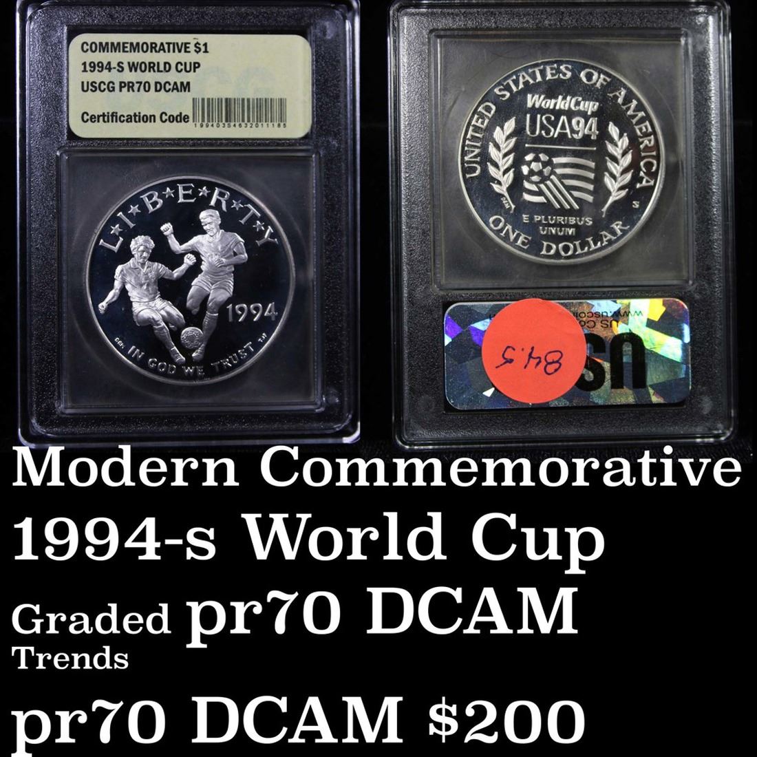 1994-s World Cup Modern Commem Dollar $1 Graded GEM++ Proof Deep Cameo By USCG. The 1994 World Cup Silver Dollar was issued as part of a three coin program to celebrate the XV FIFA World Cup playoff. This Perfect coin is graded Gem+++ Proof Deep cameo by USCG.