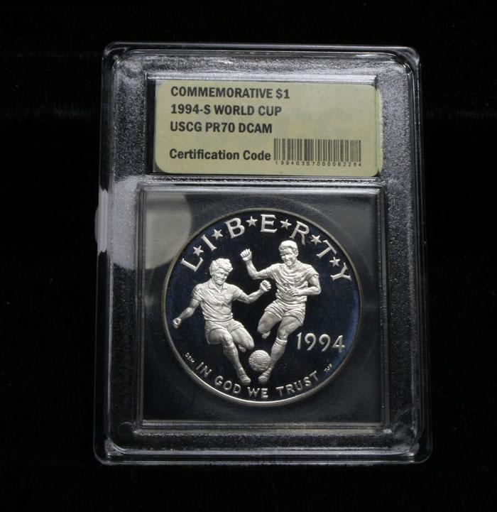 The 1994 World Cup Silver Dollar was issued as part of a three coin program to celebrate the XV FIFA World Cup playoff.. PCGS lists PR70 DCAM as $1050. This Perfect coin is graded PR70 Deep cameo by USCG. Estimated Value $300
