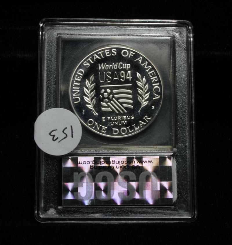 The 1994 World Cup Silver Dollar was issued as part of a three coin program to celebrate the XV FIFA World Cup playoff.. PCGS lists PR70 DCAM as $1050. This Perfect coin is graded PR70 Deep cameo by USCG. Estimated Value $300