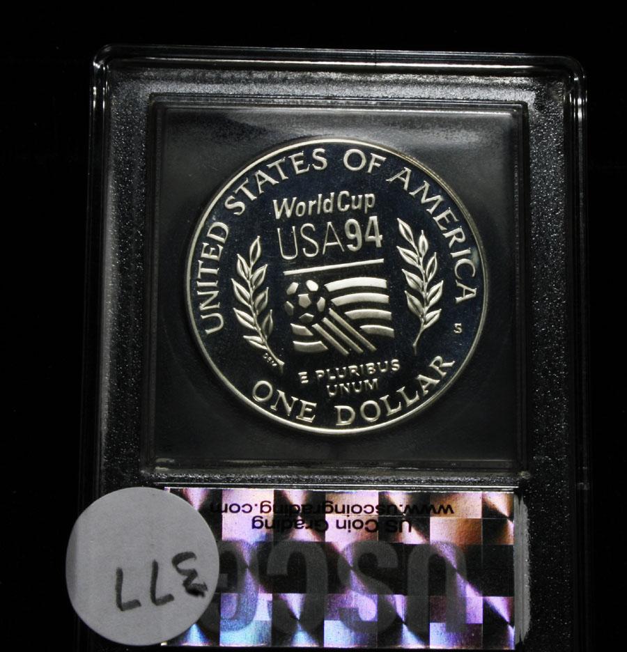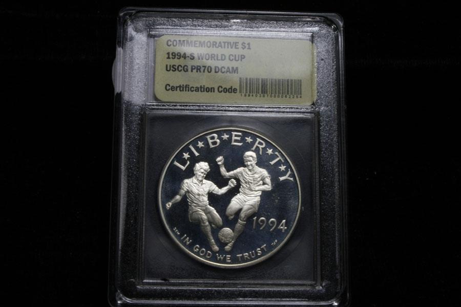 The 1994 World Cup Silver Dollar was issued as part of a three coin program to celebrate the XV FIFA World Cup playoff.. PCGS lists PR70 DCAM as $1050. This Perfect coin is graded PR70 Deep cameo by USCG. Estimated Value $300