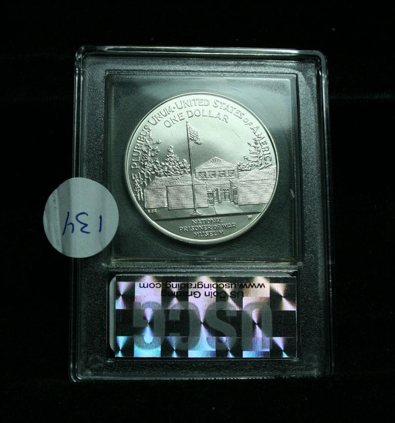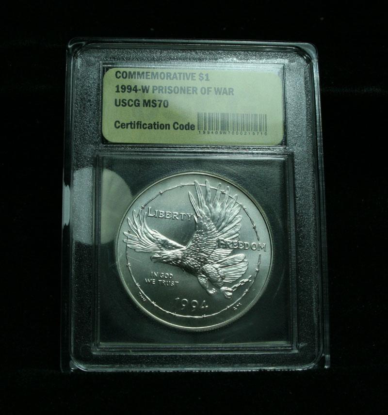 The 1994 Prisoner of War Memorial Silver Dollar was one of three similar silver dollar commemorative coin programs including the Women in Military Service Memorial and Vietnam Veterans Memorial Dollars. This coin was issued for the Prisoner of War Memorial Museum to be built in Andersonville, Georgia PCGS lists ms70 at $420. This coin is graded ms70 by USCG. Estimated Value $150