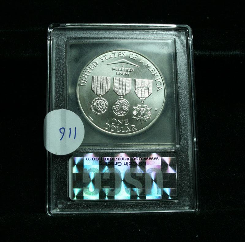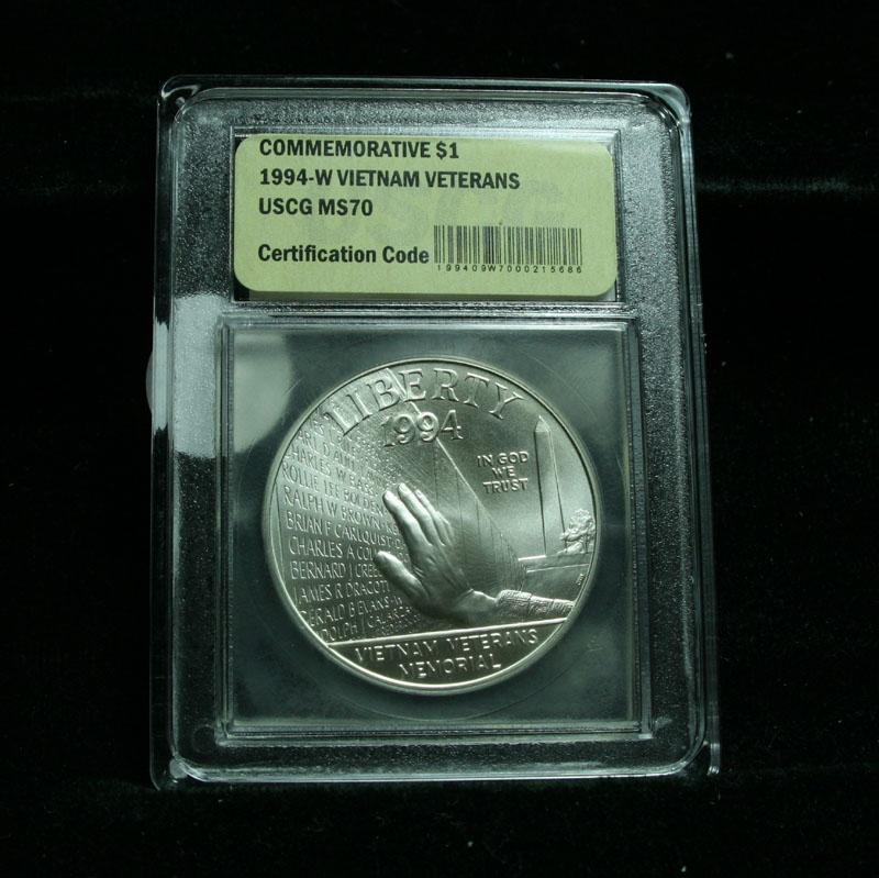 The 1994 Vietnam Veterans Memorial Silver Dollar was one of three similarly themed commemorative coin programs. The other two programs featured Women in Military Service Memorial and Prisoners of War Memorial Dollars. This coin was issued to mark the 10th anniversary of the dedication of the Vietnam Veterans Memorial Wall in Washington, DC. PCGS lists ms70 at $385. This coin is graded ms70 by USCG. Estimated Value $150
