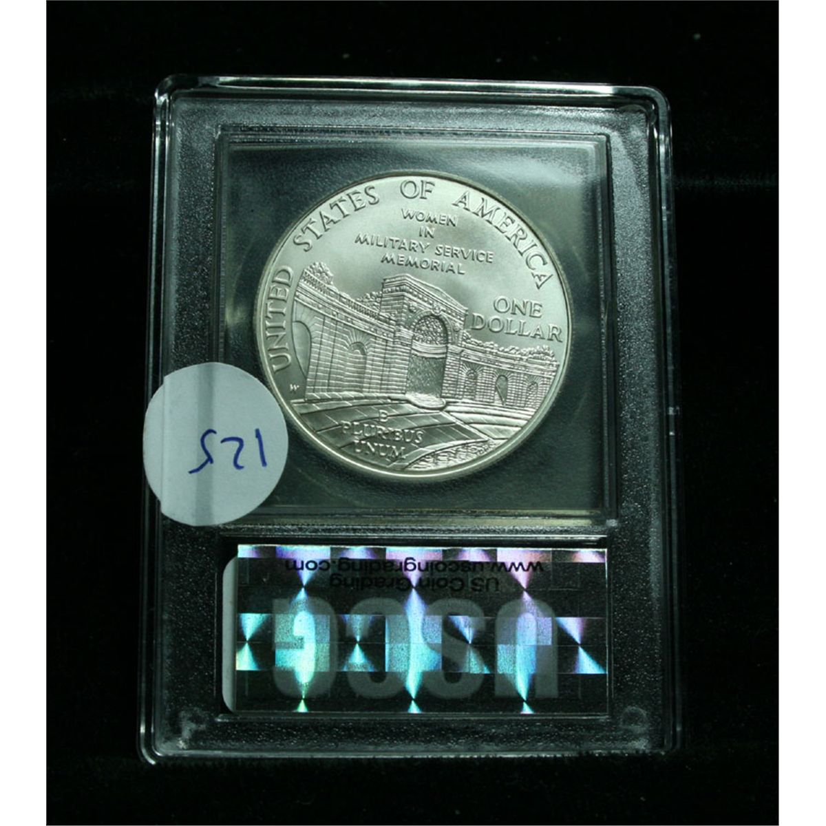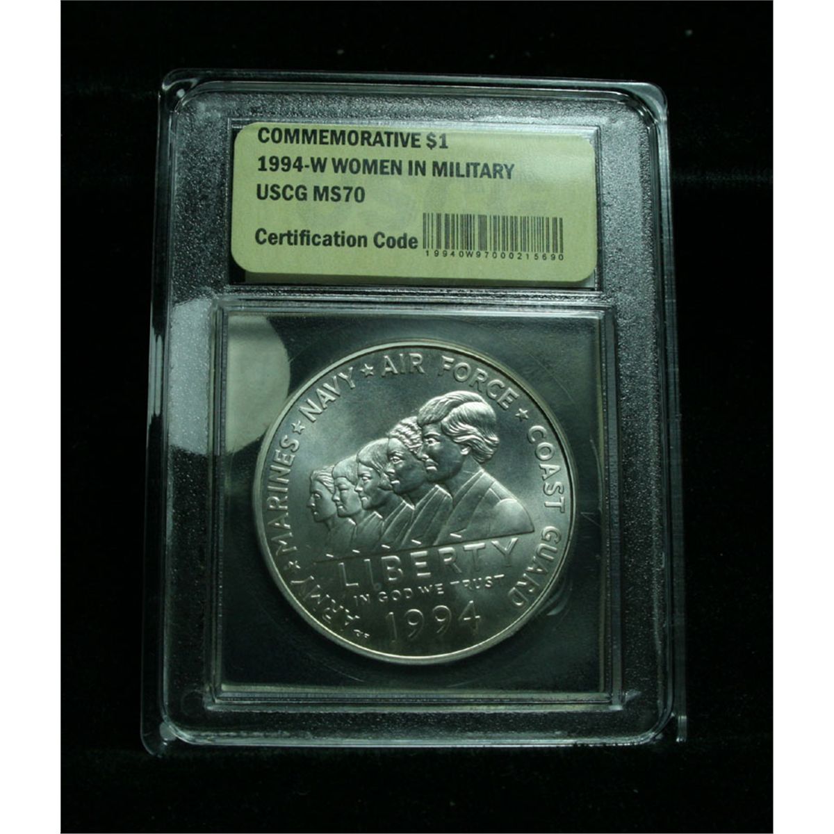 The 1994 Women in Military Service Silver Dollar was one of three similar silver dollar commemorative coin programs including the Women in Military Service Memorial and Vietnam Veterans Memorial Dollars. The 1994 Women in Military Service Memorial Silver Dollar was issued for the construction of a new memorial complex for women in military service. PCGS Price Guide lists ms70 at $325. This coin is graded a Perfect ms70 by USCG. Estimated Value $150