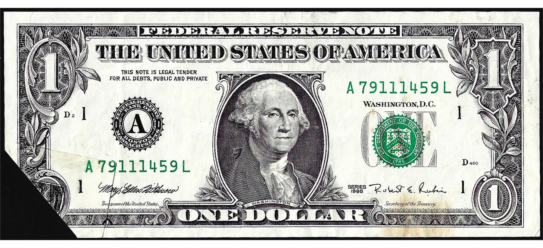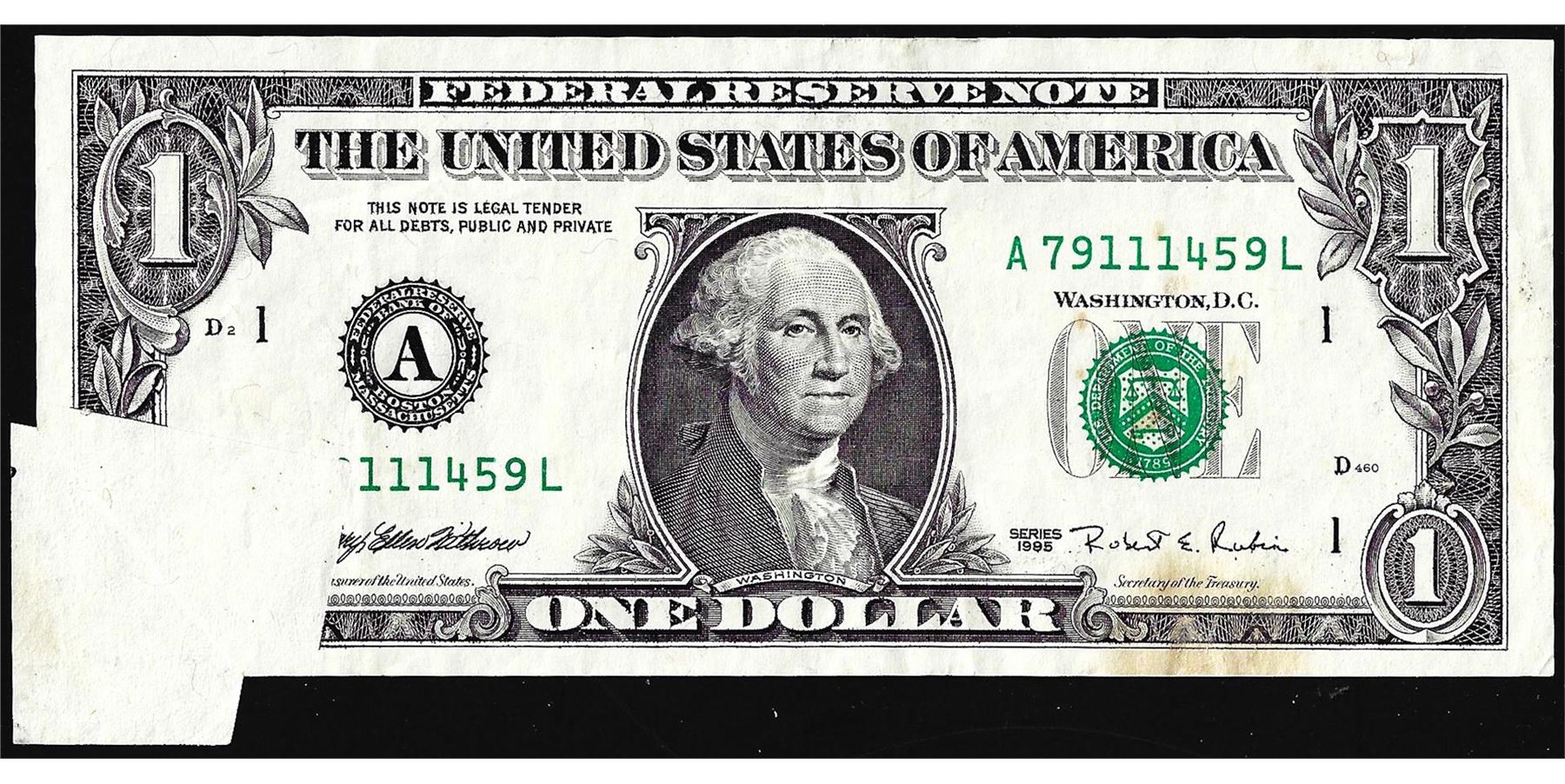 One 1995 $1 Federal Reserve Butterfly Fold Over Error Note Boston.