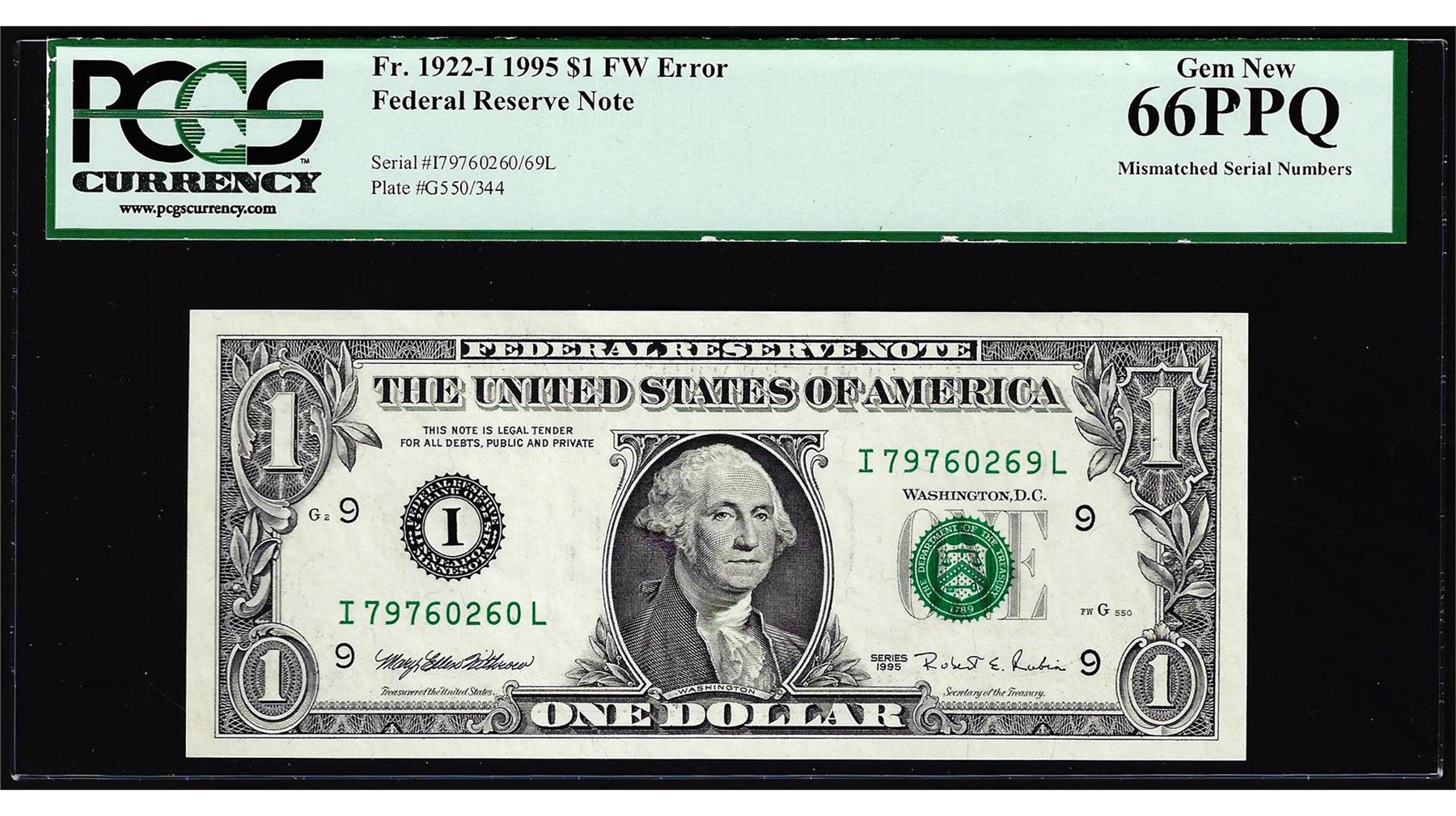 One 1995 $1 Federal Reserve Note Mismatched Serial Number ERROR PCGS Gem New 66PPQ. PCGS Graded.