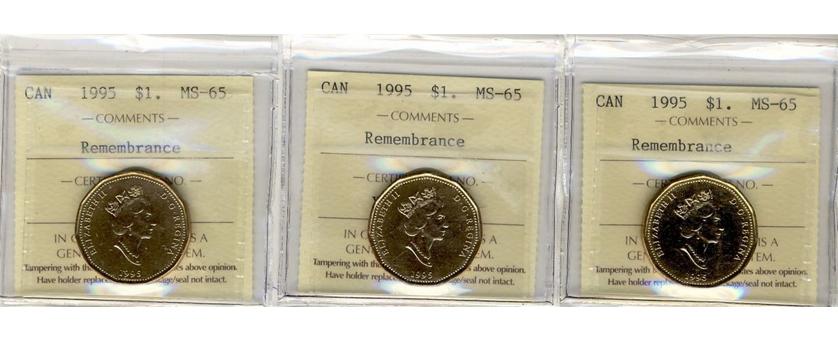 1995 $1 Remembrance ICCS MS65. Lot of 3 coins.