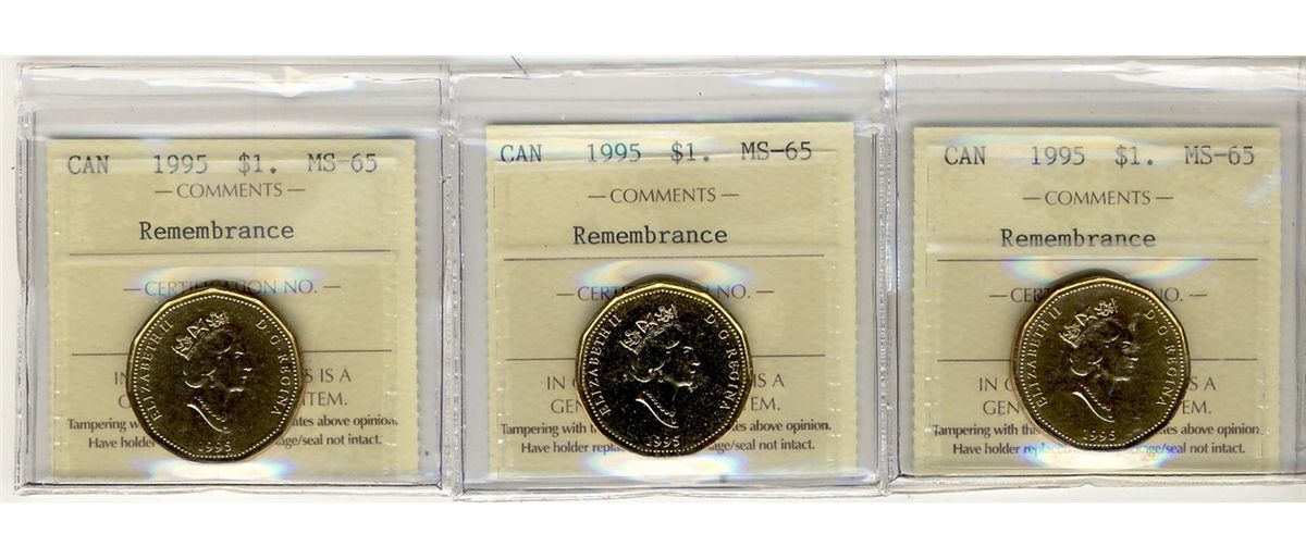 1995 $1 Remembrance ICCS MS65. Lot of 3 coins.