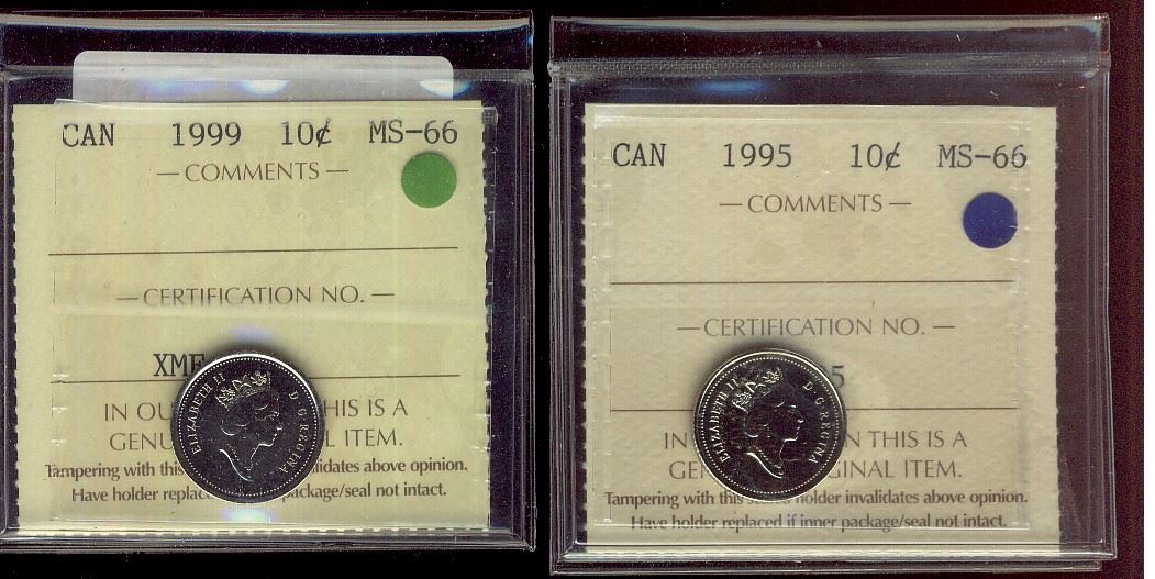 1995 10¢ & 1999 ICCS MS66. Lot of 2 coins.