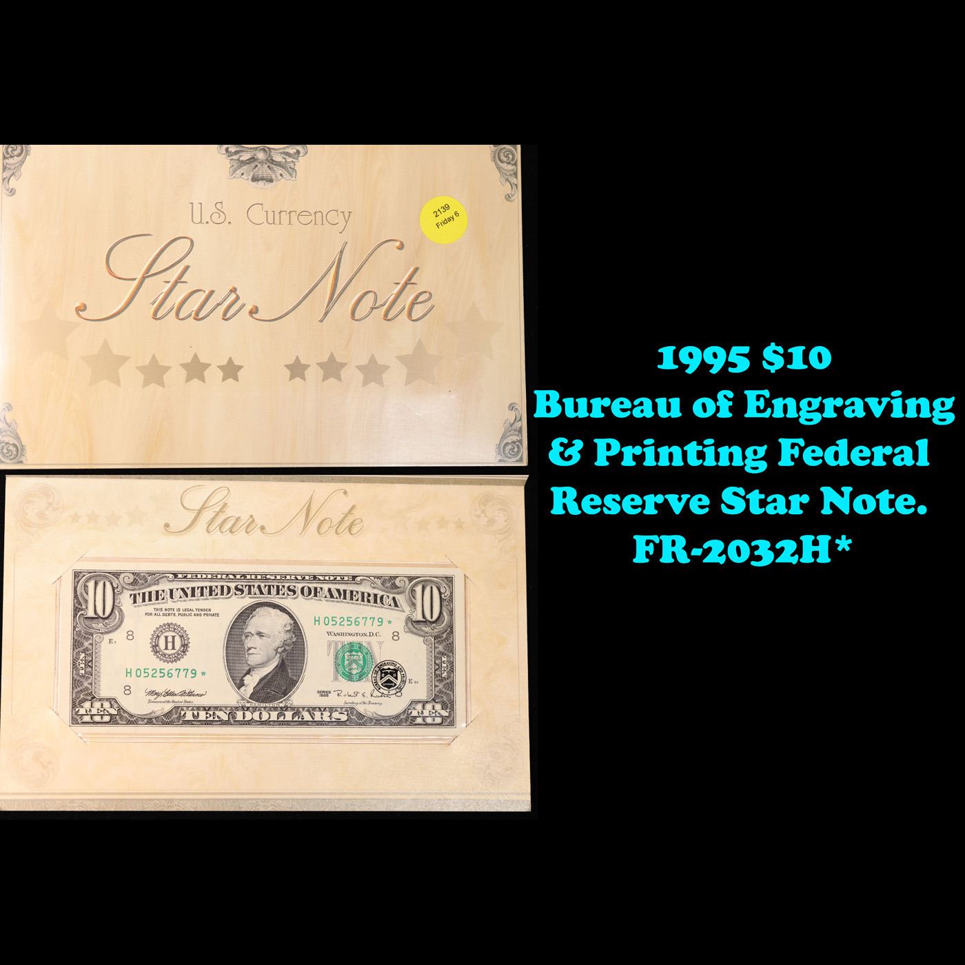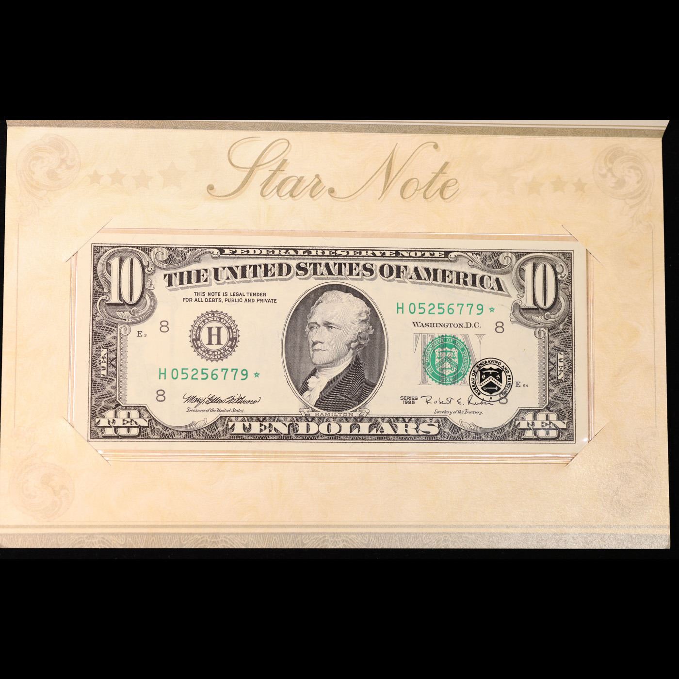 1995 $10 Bureau of Engraving & Printing Federal Reserve Star Note. FR-2032H*. A uncirculated Series 1995 $10 star note from the St. Louis Federal Reserve Bank. Printed at Fort Worth and issued in its original BEP folder.