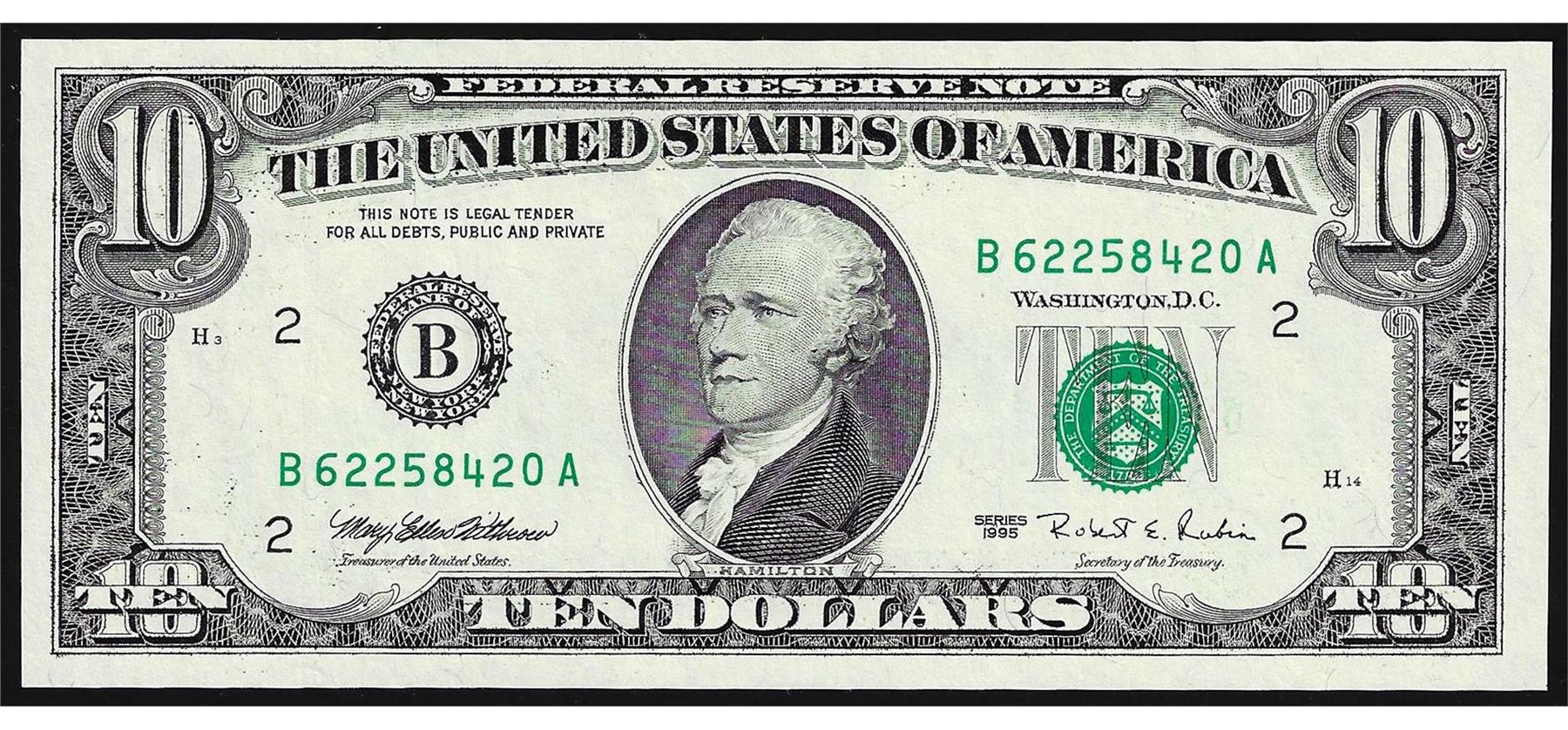 One 1995 $10 Federal Reserve Note ERROR Insufficient Inking.
