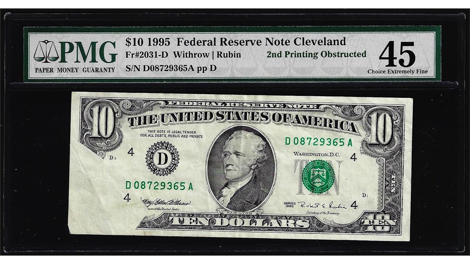 One 1995 $10 Federal Reserve Note ERROR 2nd Printing Obstructed PMG Choice Extremely Fine 45. PMG Certified.