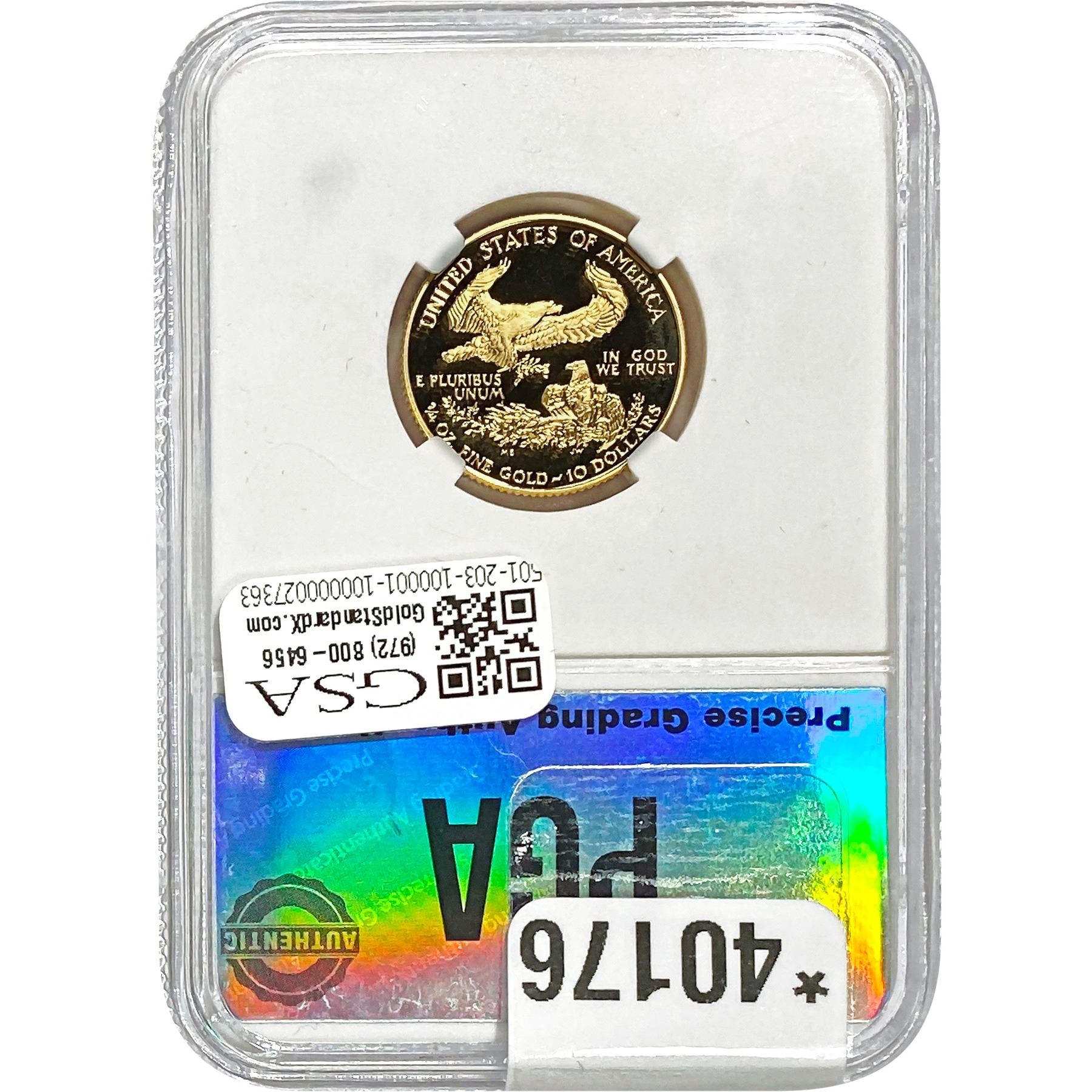 e. Coins sold referencing a third-party grading service are sold “AS IS” without any express or implied warranty, except for a guarantee by GSA that they are genuine. Removal or alteration of the holder, voids all of Bidder’s claims concerning that Product. Certain warranties may be available from the grading services and Bidders are referred to them for further details: Numismatic Guaranty Corporation (NGC), PO Box 4776, Sarasota, FL 34230, www.ngccoin.com/services/writtenguarantee.asp; Professional Coin Grading Services (PCGS), PO Box 9458, Newport Beach, CA 92658, www.pcgs.com/guarantee.html; ANACS, 6555 S. Kenton St., Ste. 303, Englewood, CO 80111; and Independent Coin Grading Co. (ICG), 7901 East Bellview, Ave., Suite 50, Englewood, CO 80111.