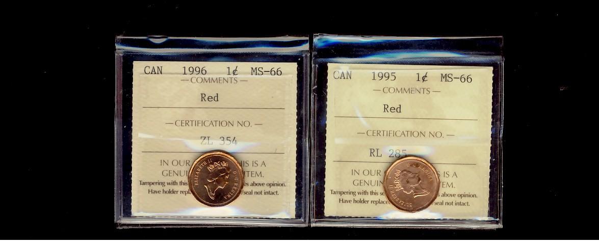 1995 & 1996 1¢ ICCS MS66RD. Lot of 2 coins.