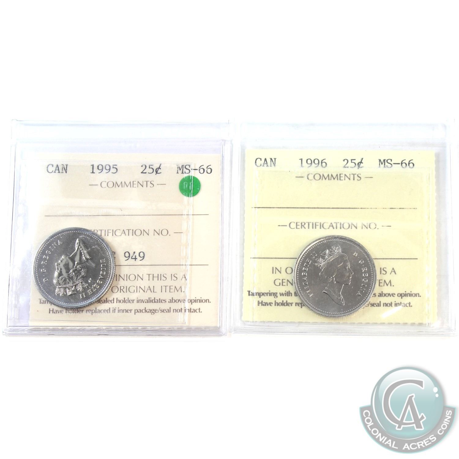 1995 & 1996 Canada 25-cent ICCS Certified MS-66. 2pcs