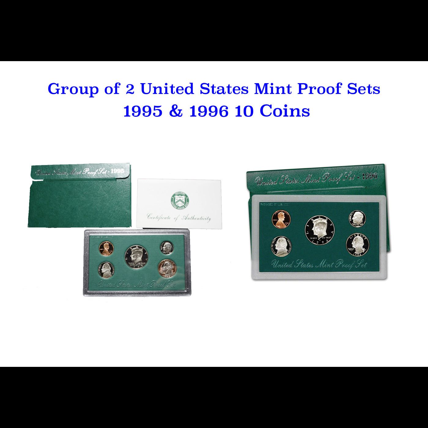 1995-1996 United States Mint Proof Set. 10 Coins Inside.. Group of 2 United States Proof Sets 1995-1996 10 coins. All coins included in the set were struck at the San Francisco Mint. Each set contains a Half Dollar, a Quarter, a Dime, a Jefferson Nickle and a Lincoln penny. Harder Set. The packaging for the 1995-1996 Proof Set was themed in green. The coins were placed in individual spaces in a green cardboard. This was sealed within a plastic lens . The outer box was greenand had silver printing “United States Mint Proof Set 199_”.