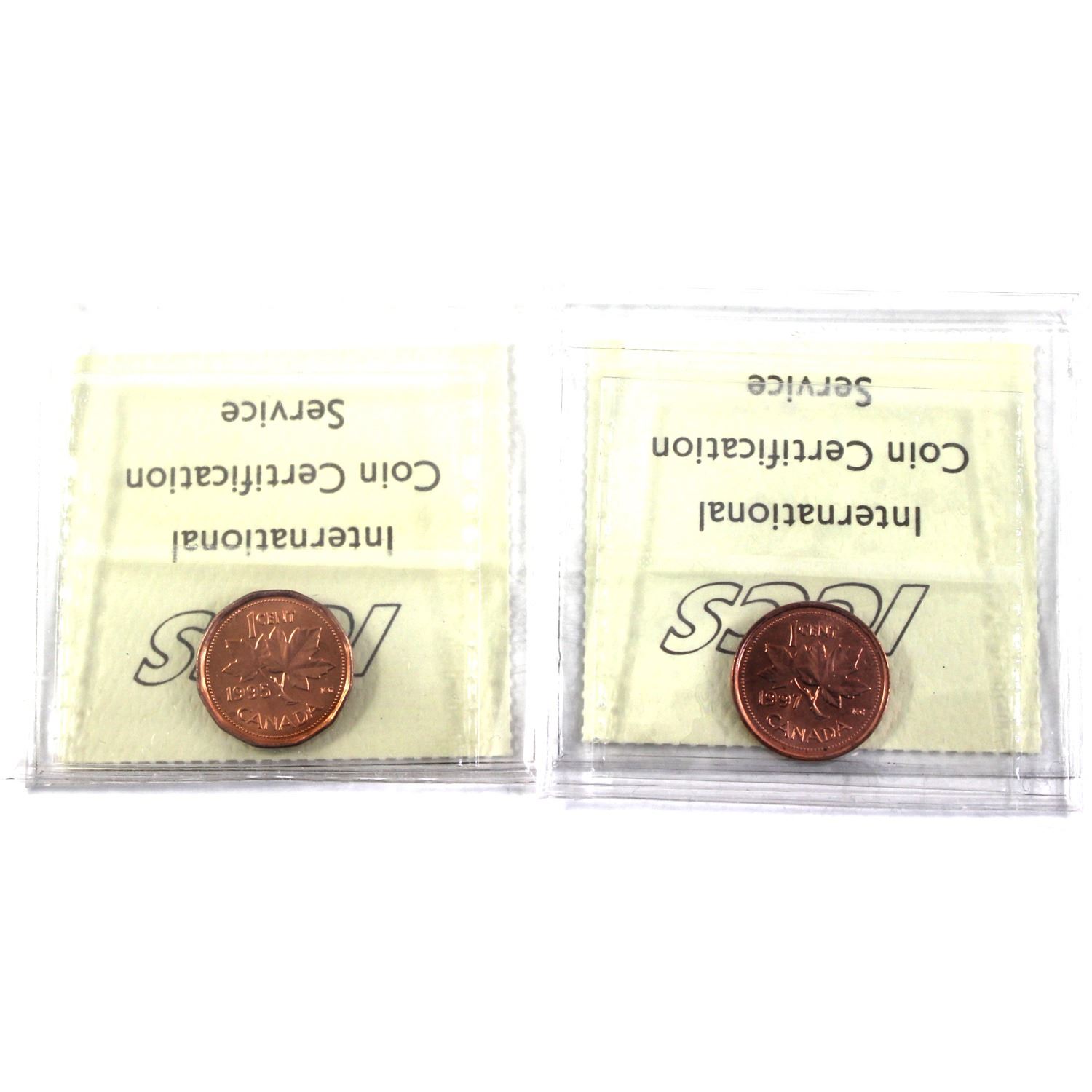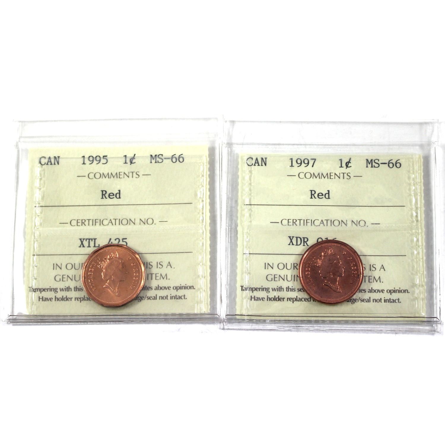 1995 & 1997 Canada 1-cent ICCS Certified MS-66, Red. 2pcs.