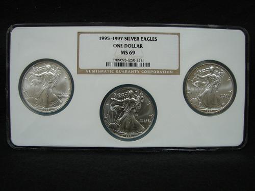 1995-1997 AMERICAN EAGLE SILVER DOLLARS. Consists of 1995, 1996, and 1997 coins. Graded by NGC. MS 69.