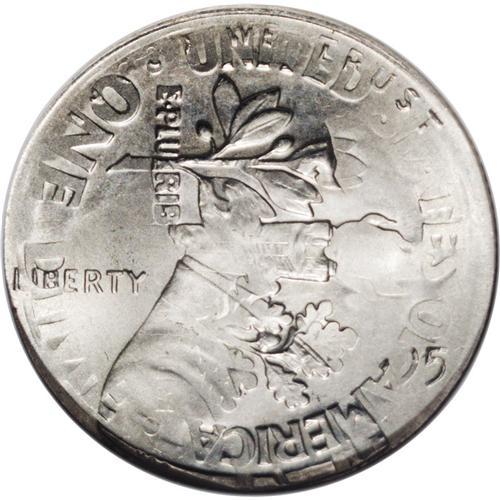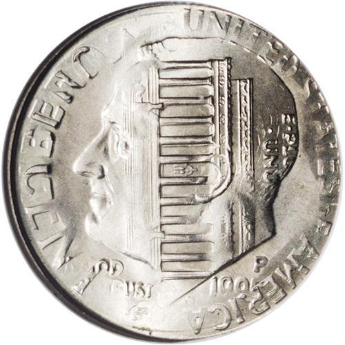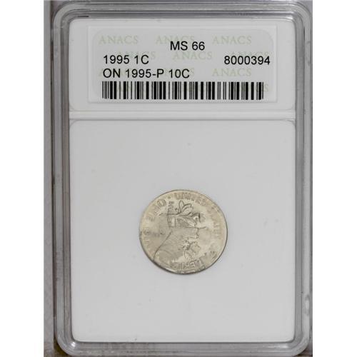 <B>1995<1C> Lincoln Cent--Struck on a 1995-P Roosevelt Dime--MS66 ANACS.</B></I> The Lincoln cent design is dominant on both sides, but remnants of the dime undertype are still readily evident. The second obverse impression is rotated 90 degrees clockwise in relation to the first impression. The reverse of the dime shows on the obverse, vice versa for the reverse side.