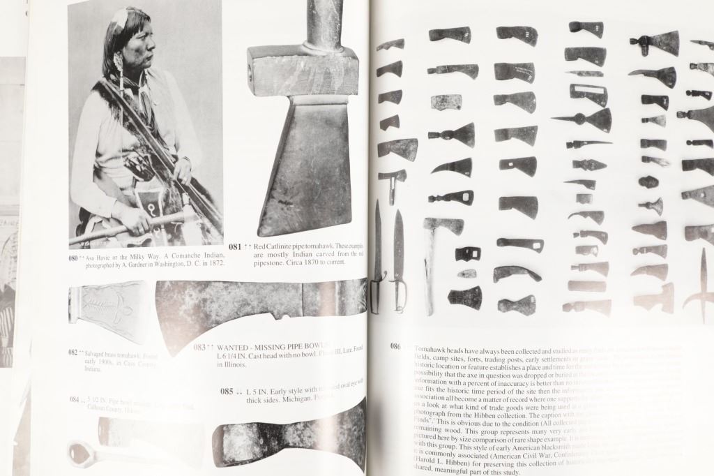 For your consideration is this 1995 first edition of "Tomahawks Pipe Axes" by John Baldwin. This book is a historically significant perspective combined with pictures from the top collections in the country ensuring authentic documented artifacts from the American Frontier. The book shows a brown hardcover and gold gilt letter and images on the front. The front reads, "Tomahawks Pipe Axes of the American Frontier / John Baldwin". The top shows an image of an ax head, while the bottom shows two different style axes crossed in an X shape. The spine shows the same gold gilt lettering and reads, "Tomahawks Pipe Axes / John Baldwin". The pages are filled with black and white illustrations and black & white and colored photos throughout. The book shows good condition overall with slight wear from its age and use over the years but no obvious signs of damage are present. The book measures 11 1/4" L x 8 11/16" W x 9/16" H.