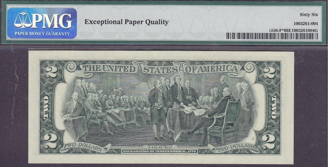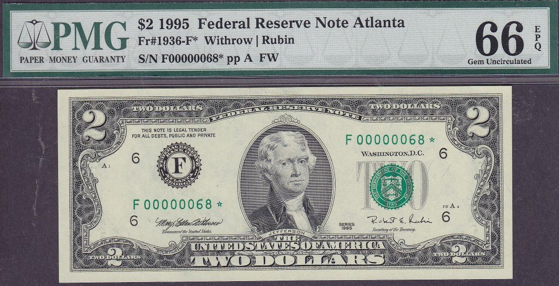 One 1995 $2 Atlanta Federal Reserve Star Note PMG 66EPQ.