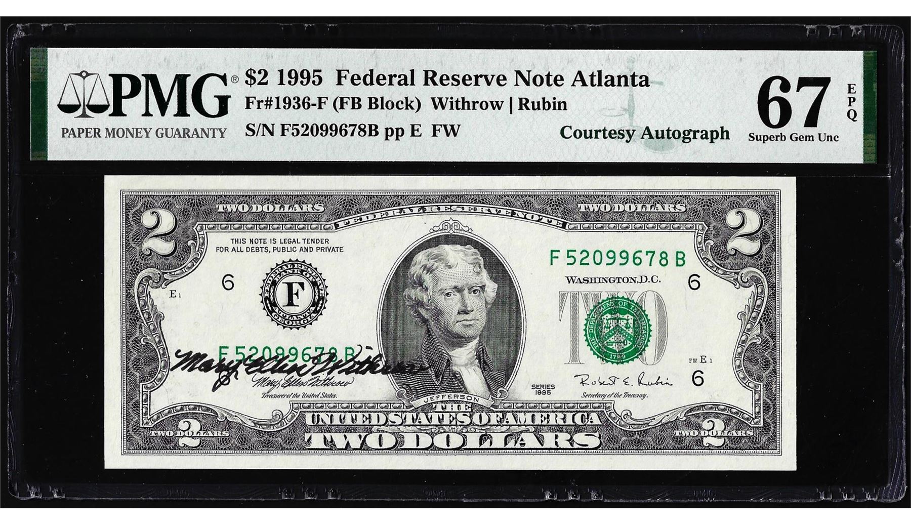 One 1995 $2 Federal Reserve Note Atlanta PMG Superb Gem Unci 67EPQ Courtesy Autograph. PMG Certified.