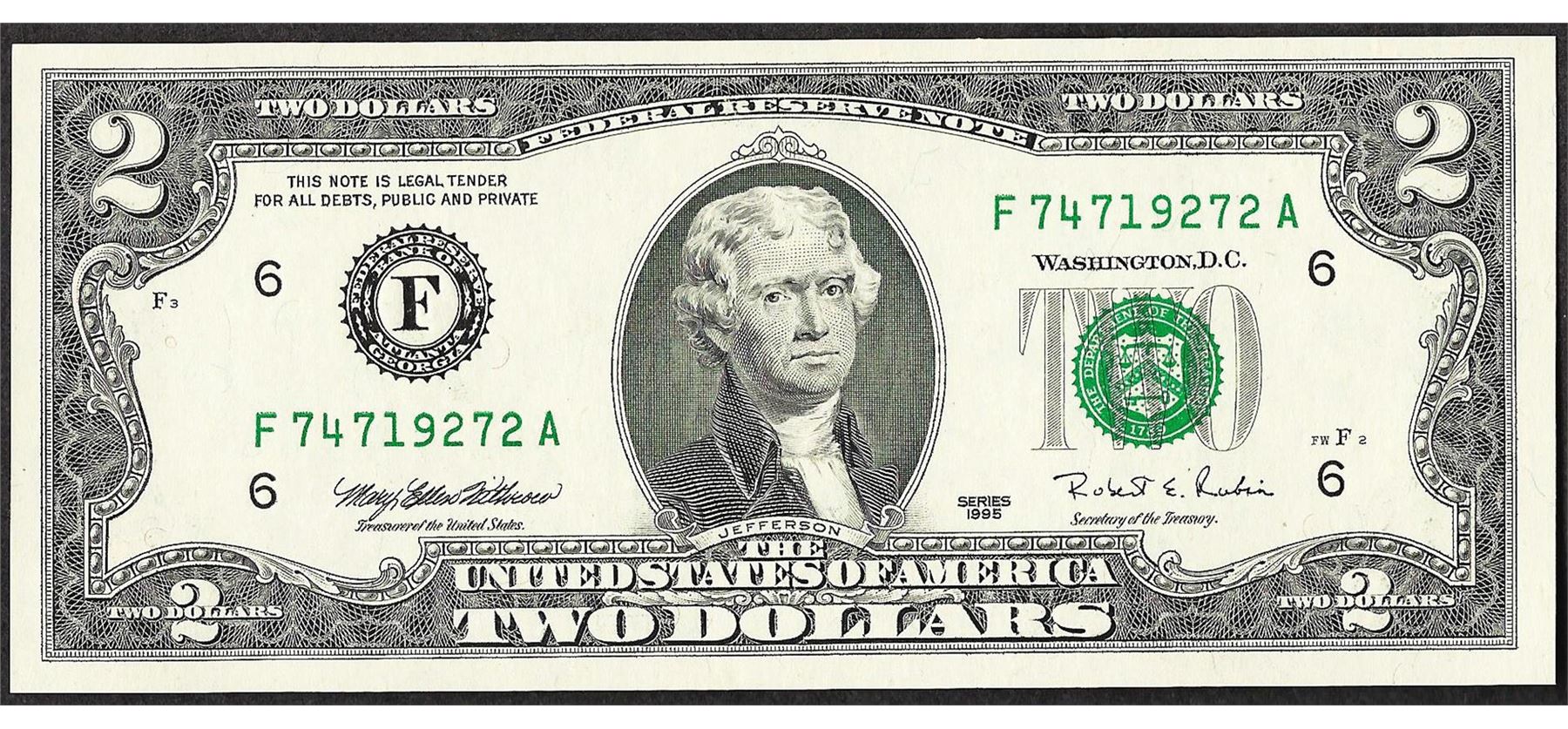 One 1995 $2 Federal Reserve Note Ink Smear ERROR.