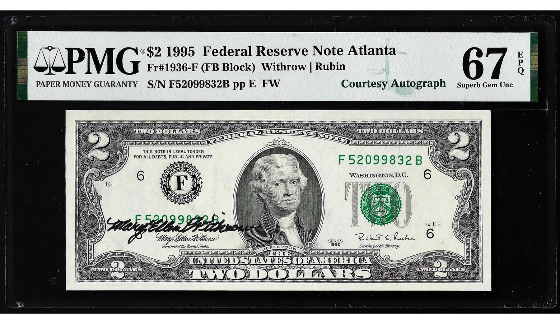 1995 $2 Federal Reserve Note PMG Superb Gem Uncirculated 67EPQ Courtesy Autograph