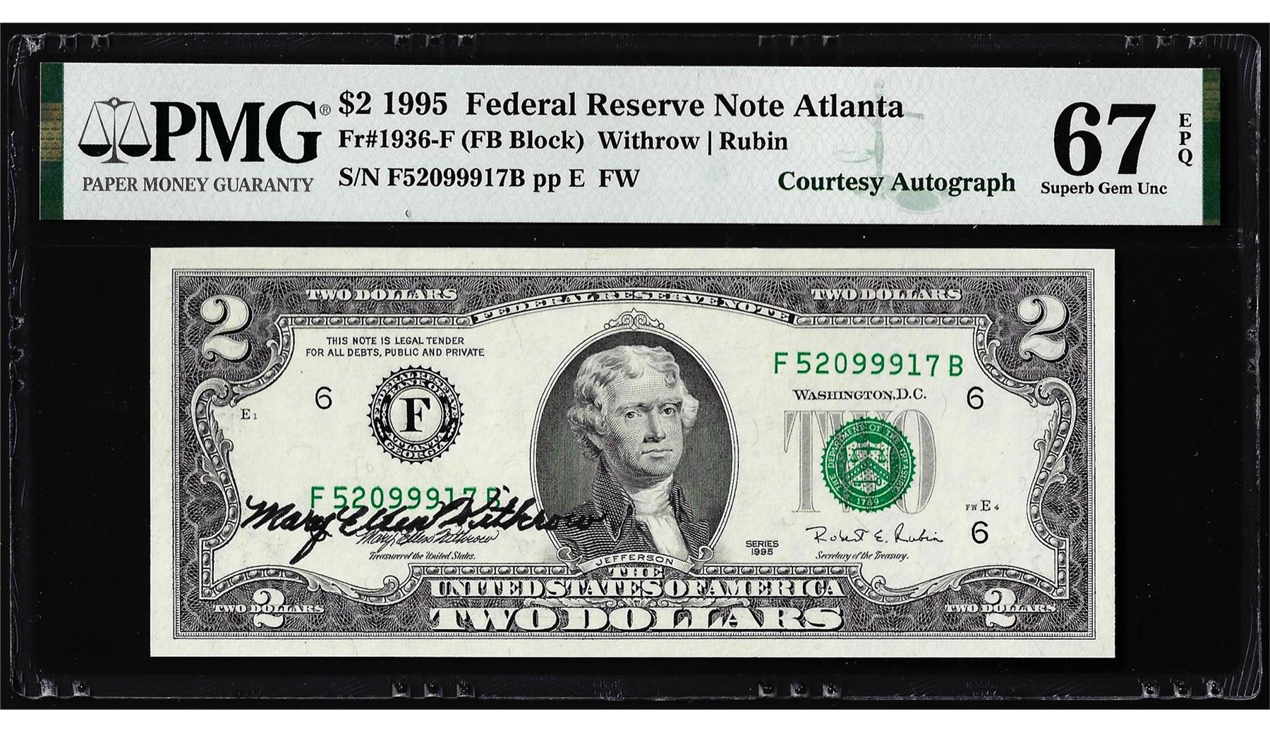 1995 $2 Federal Reserve Note PMG Superb Gem Uncirculated 67EPQ Courtesy Autograph