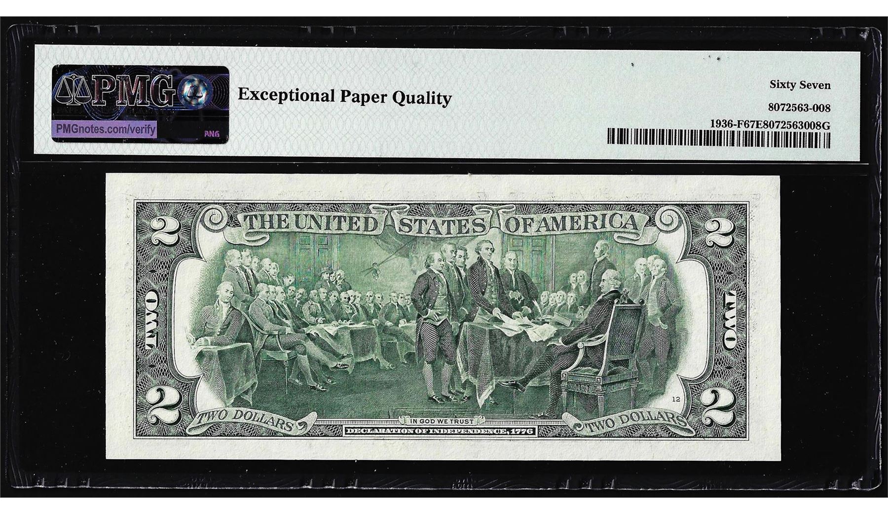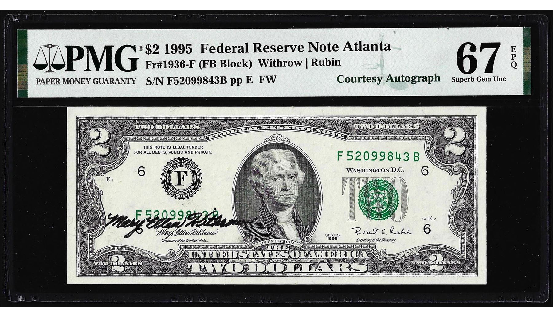 1995 $2 Federal Reserve Note PMG Superb Gem Uncirculated 67EPQ Courtesy Autograph
