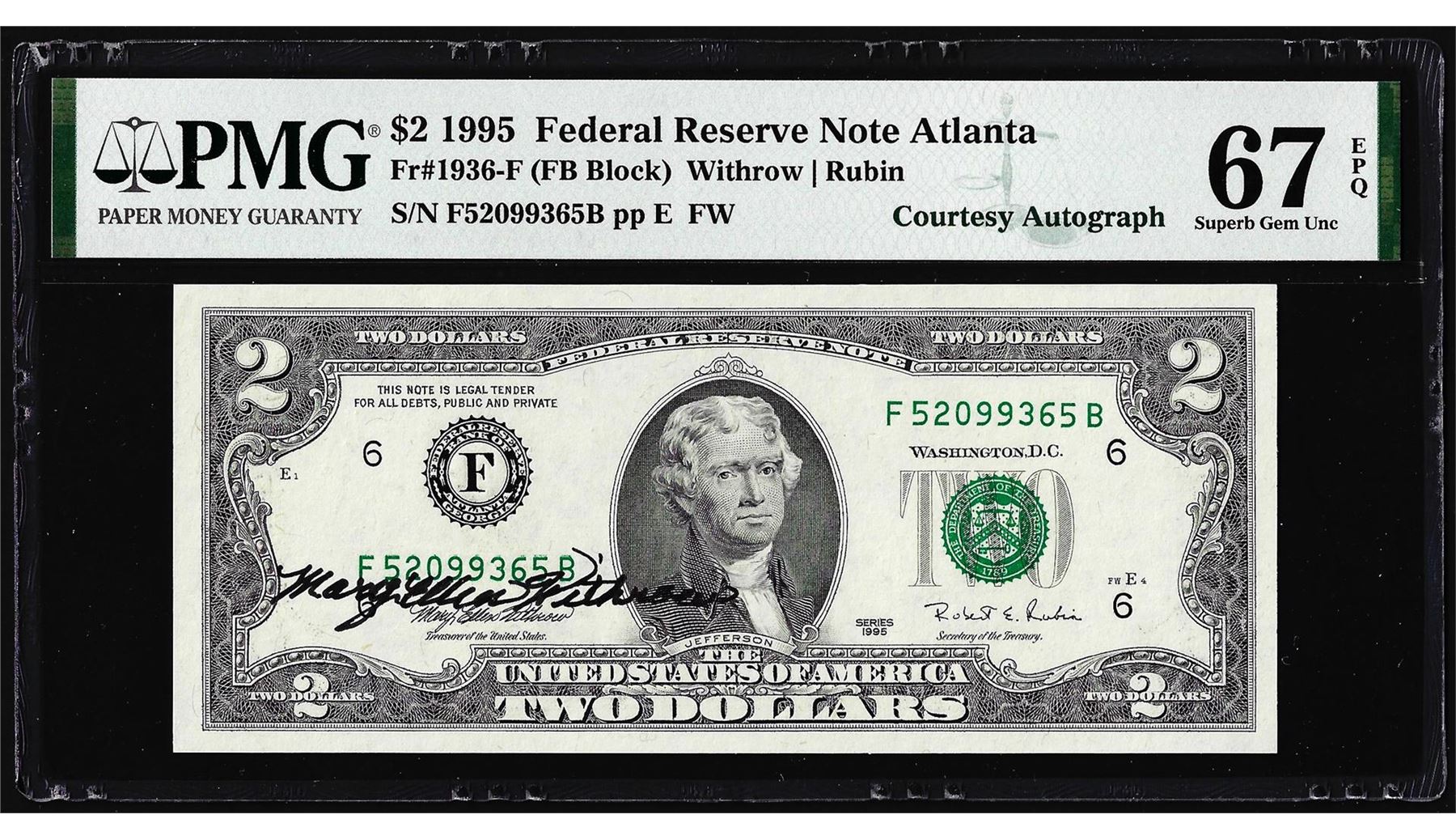 1995 $2 Federal Reserve Note PMG Superb Gem Uncirculated 67EPQ Courtesy Autograph