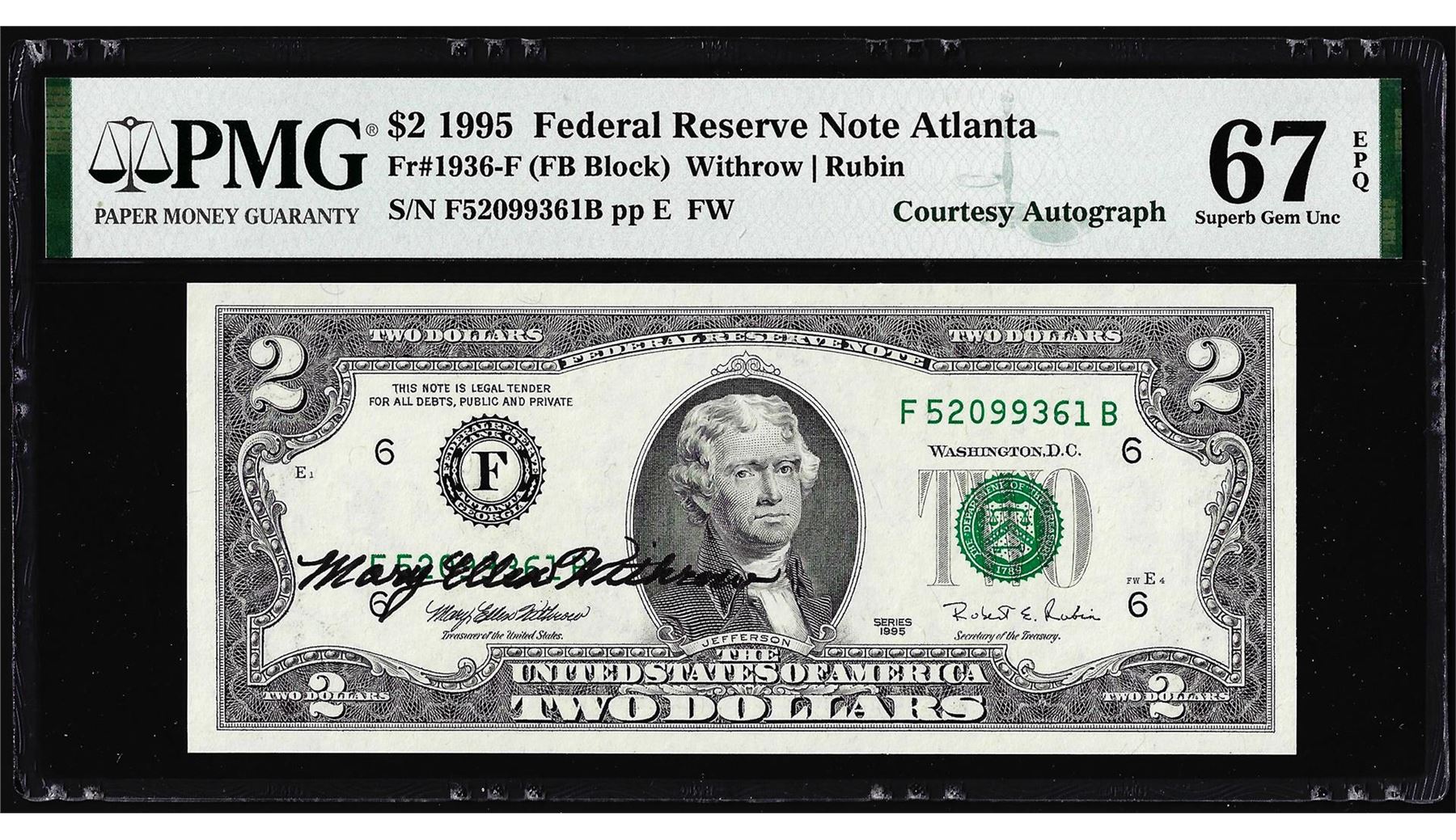 1995 $2 Federal Reserve Note PMG Superb Gem Uncirculated 67EPQ Courtesy Autograph