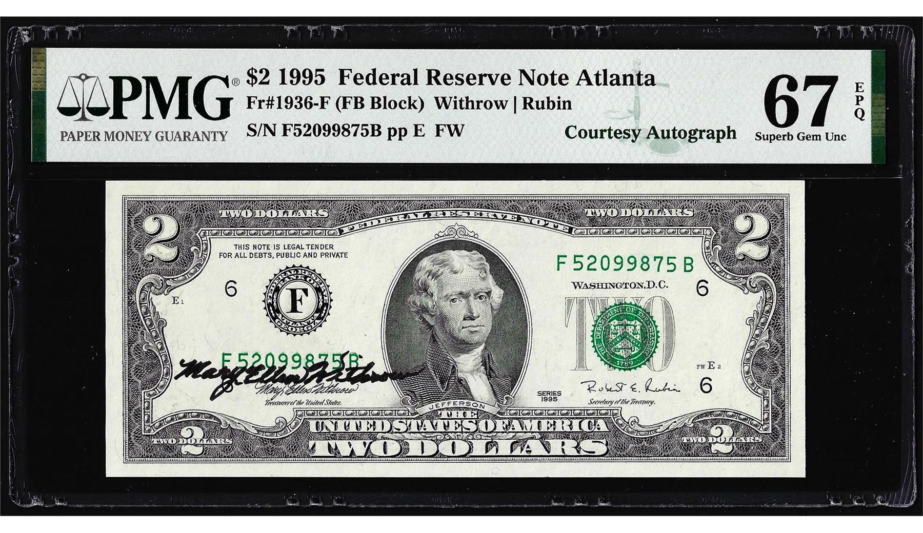 1995 $2 Federal Reserve Note PMG Superb Gem Uncirculated 67EPQ Courtesy Autograph
