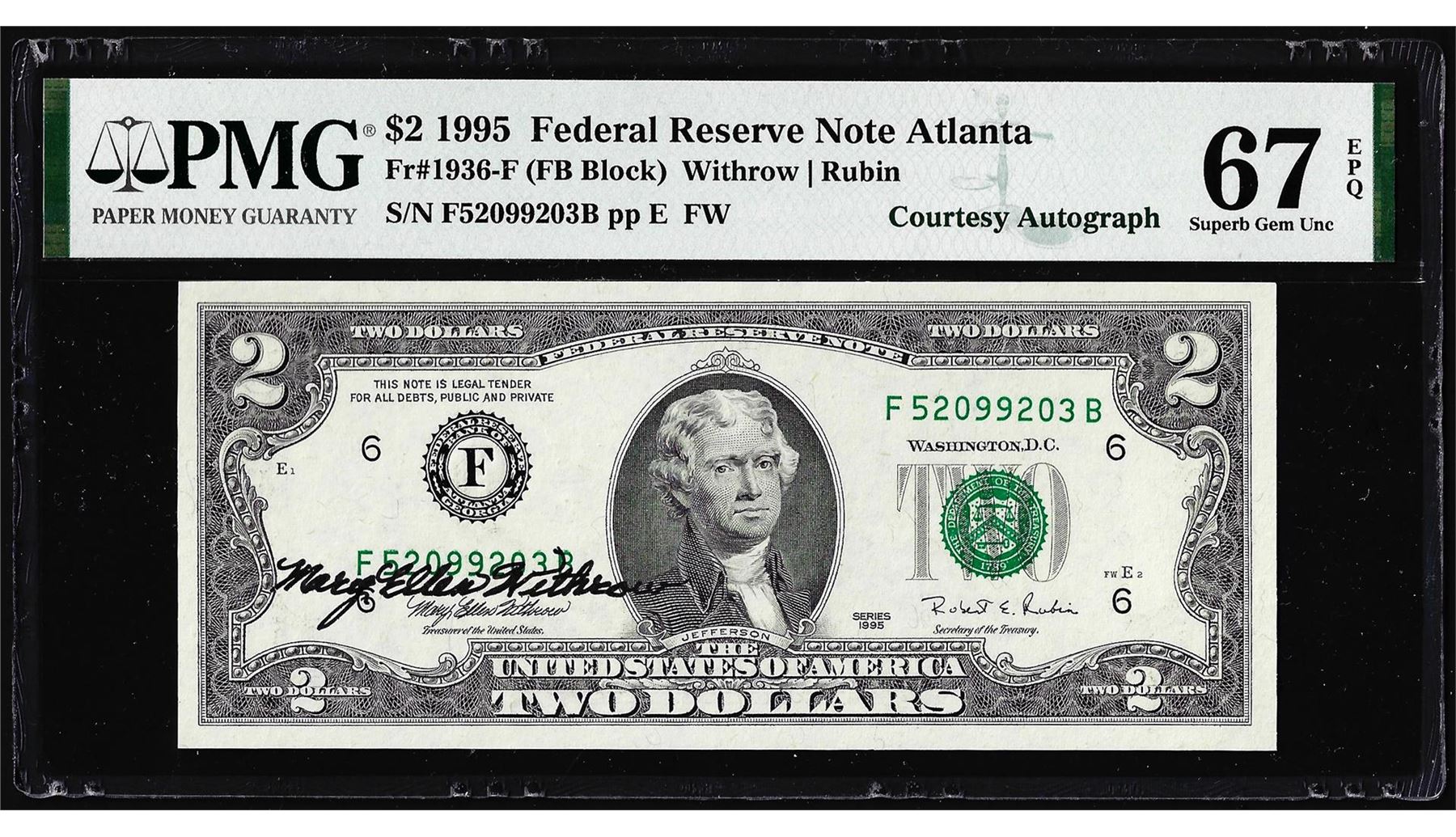 1995 $2 Federal Reserve Note PMG Superb Gem Uncirculated 67EPQ Courtesy Autograph