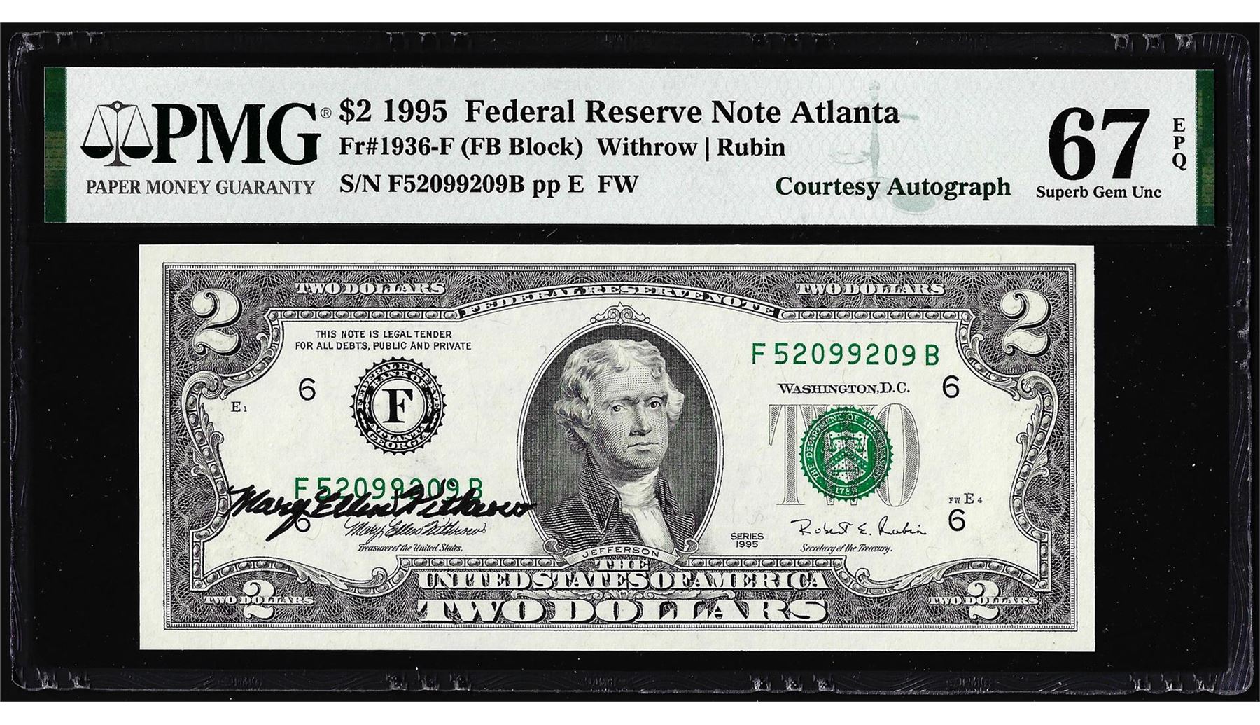 1995 $2 Federal Reserve Note PMG Superb Gem Uncirculated 67EPQ Courtesy Autograph
