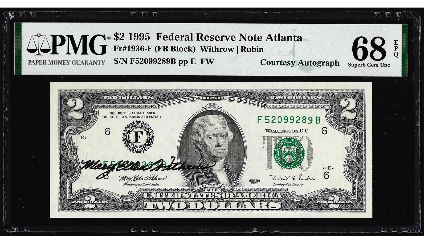 1995 $2 Federal Reserve Note PMG Superb Gem Uncirculated 68EPQ Courtesy Autograph