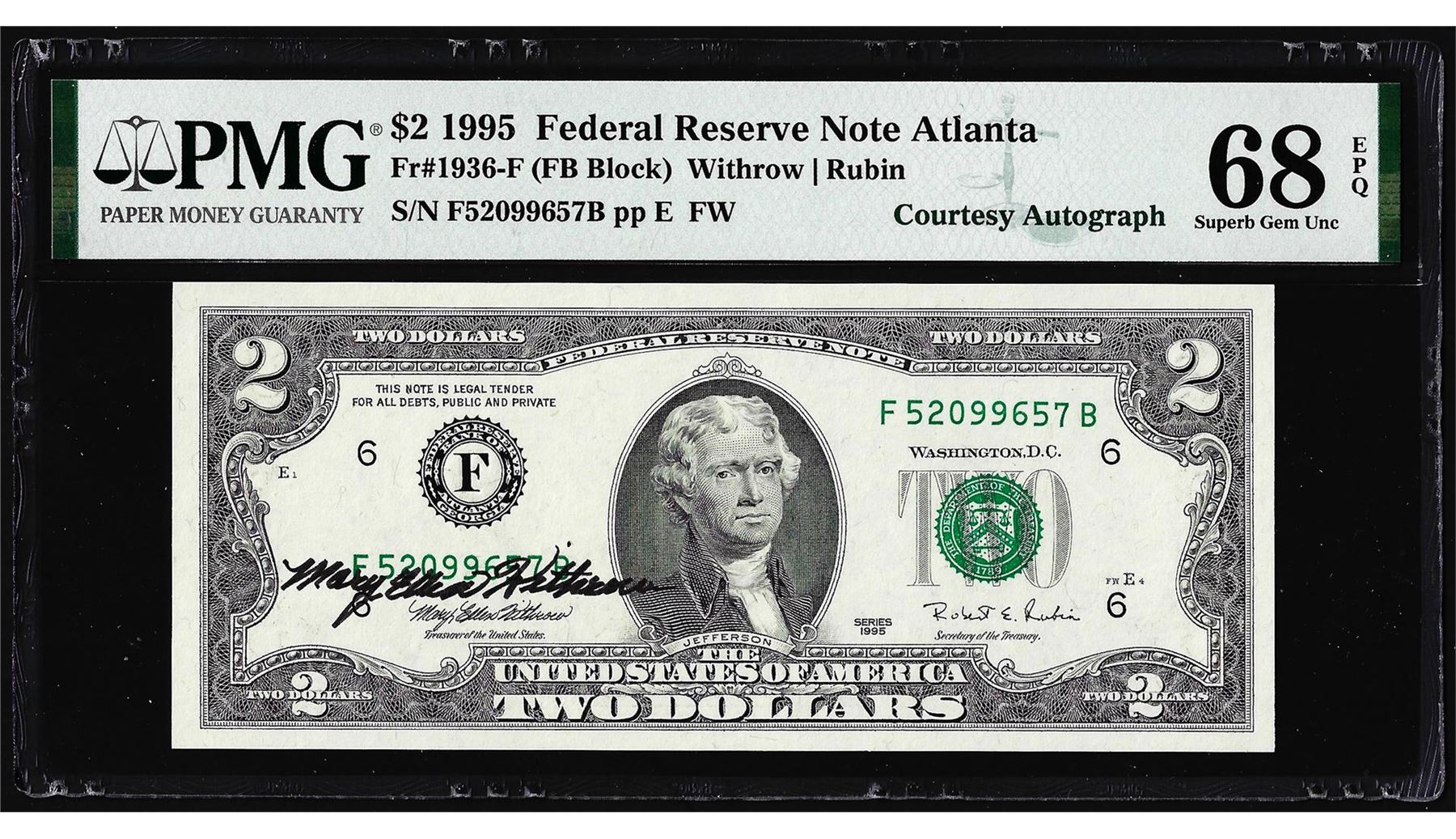 1995 $2 Federal Reserve Note PMG Superb Gem Uncirculated 68EPQ Courtesy Autograph