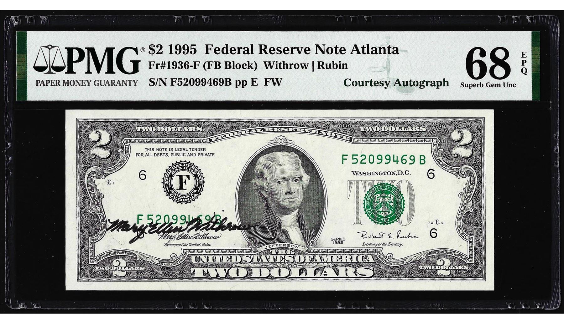 1995 $2 Federal Reserve Note PMG Superb Gem Uncirculated 68EPQ Courtesy Autograph