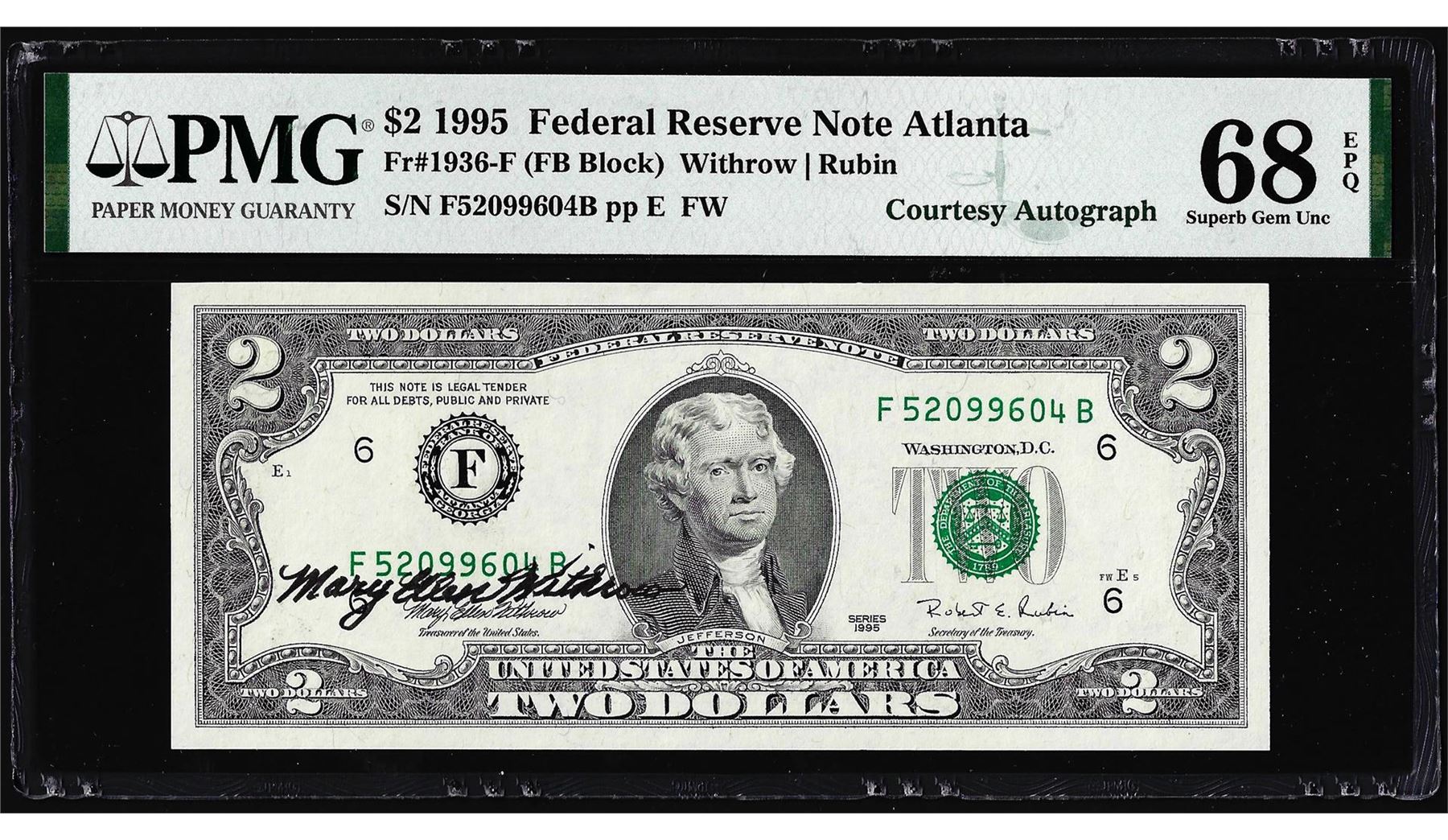 1995 $2 Federal Reserve Note PMG Superb Gem Uncirculated 68EPQ Courtesy Autograph