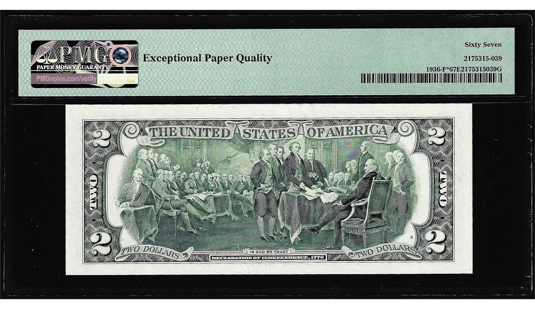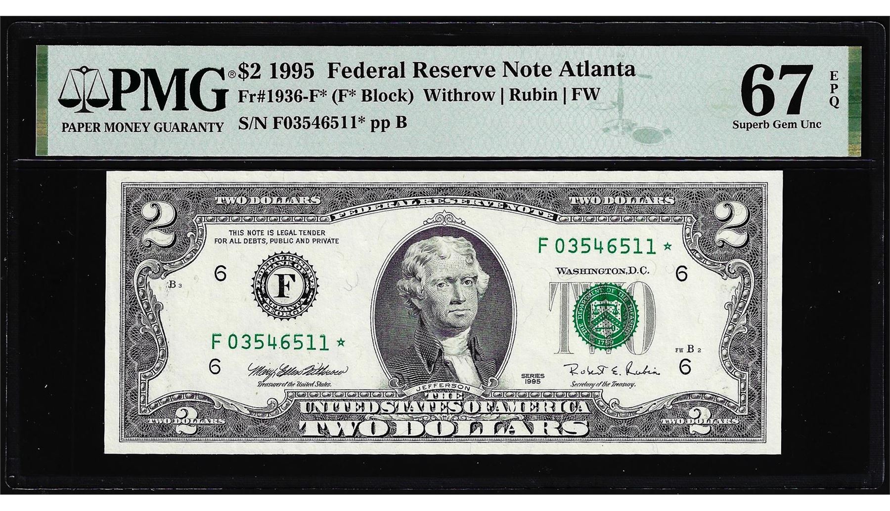 One 1995 $2 Federal Reserve STAR Note Fr.1936-F* Atlanta PMG Superb Gem Unc. 67EPQ. PMG Certified.