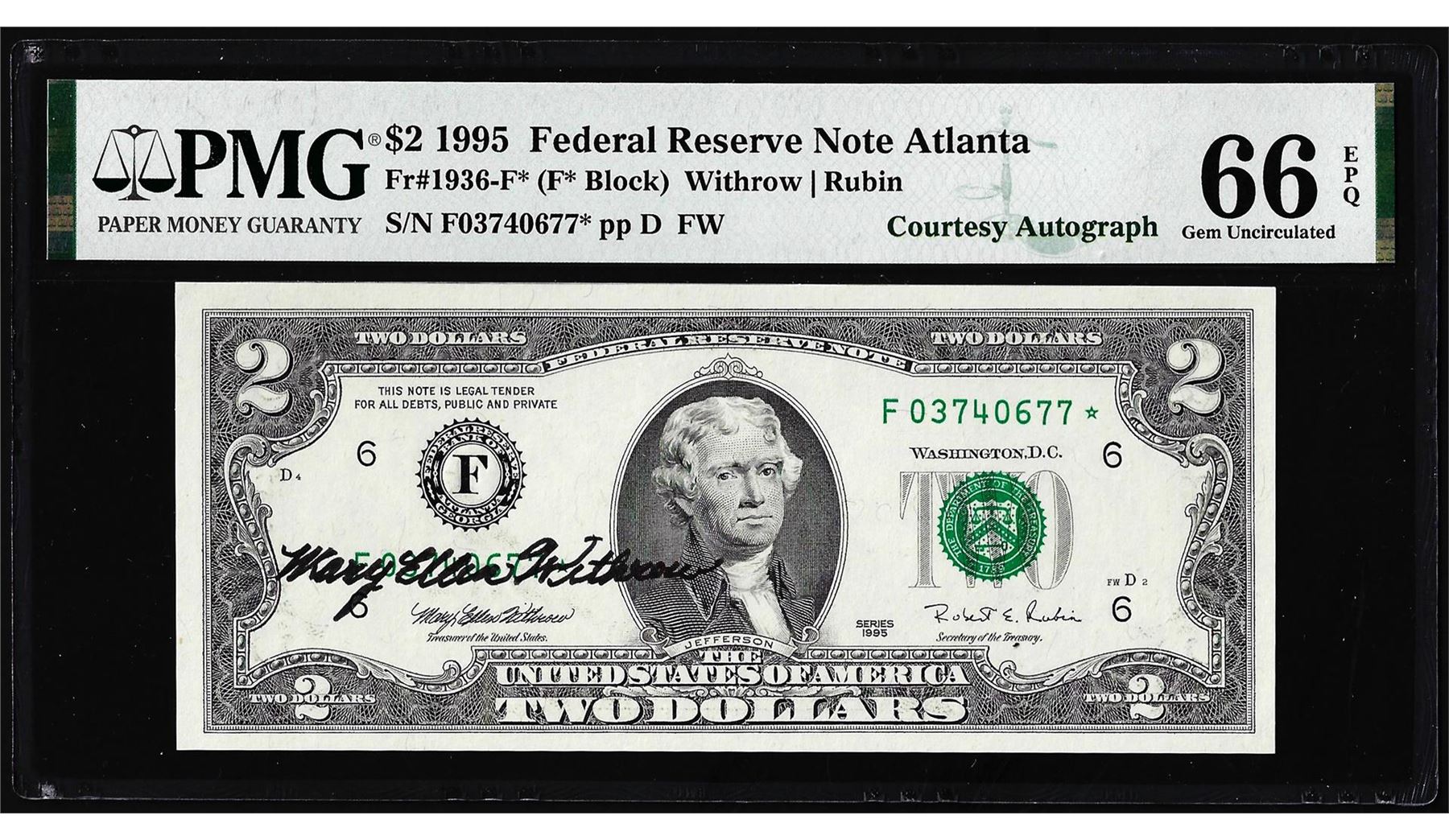 One 1995 $2 Federal Reserve Star Note Atlanta Courtesy Auto PMG Gem Uncirculated 66EPQ. PMG Certified.