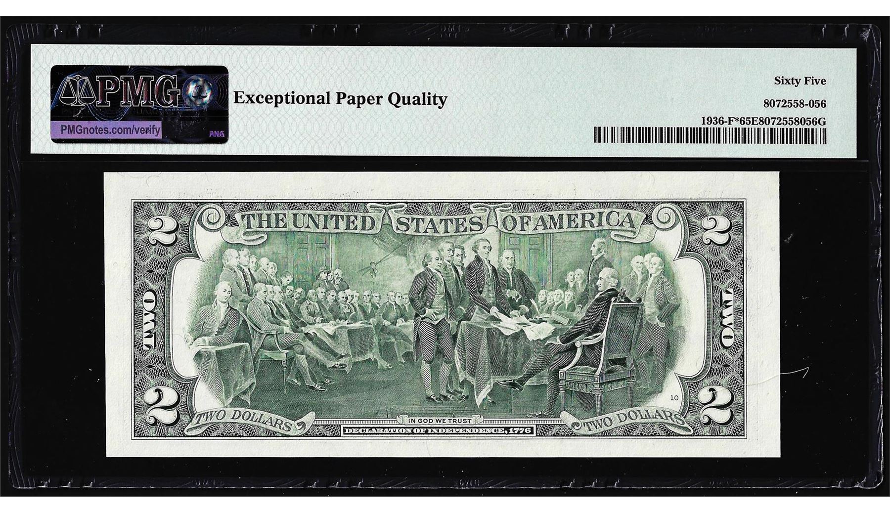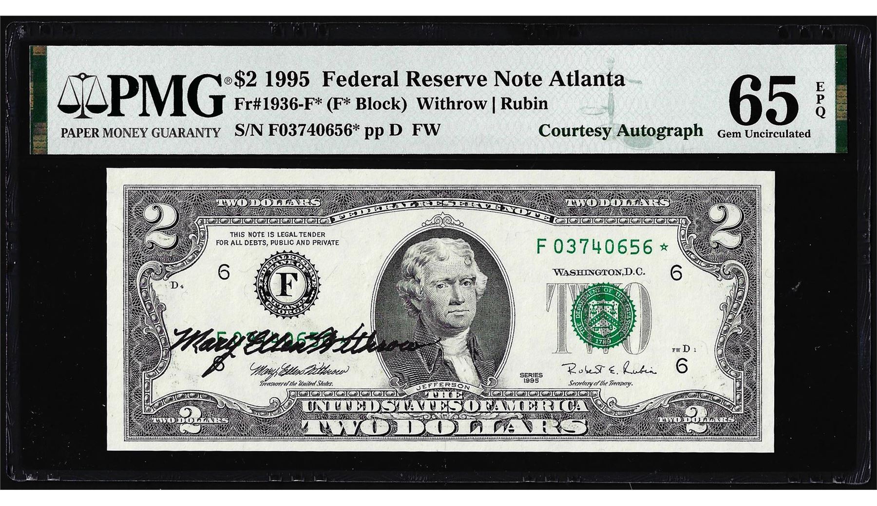 1995 $2 Federal Reserve Star Note PMG Gem Uncirculated 65EPQ Courtesy Autograph