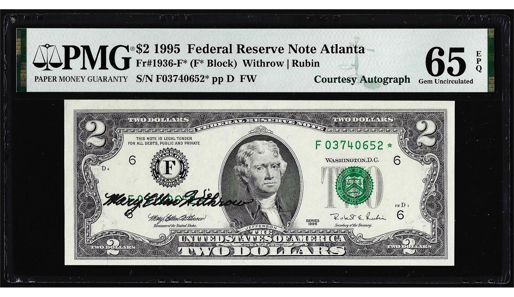 1995 $2 Federal Reserve Star Note PMG Gem Uncirculated 65EPQ Courtesy Autograph