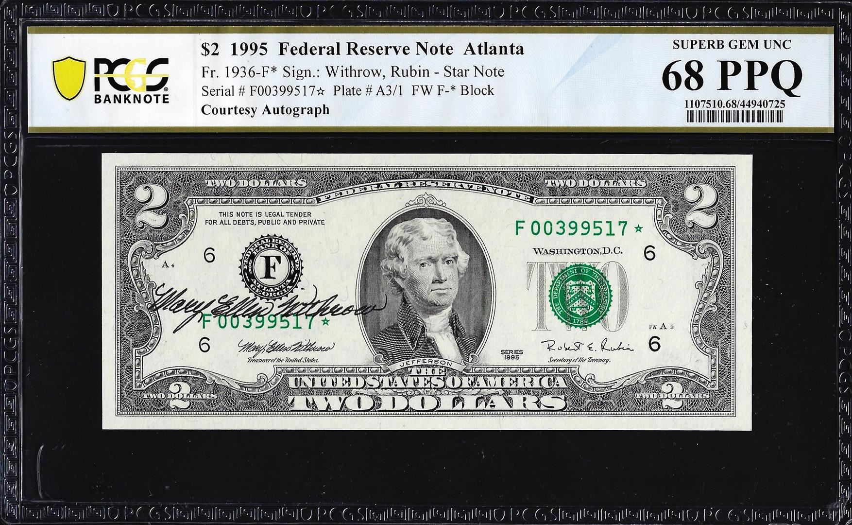 One 1995 $2 Federal Reserve Star Note with Courtesy Autograph PCGS Superb Gem Unc. 68PPQ. PCGS Graded.