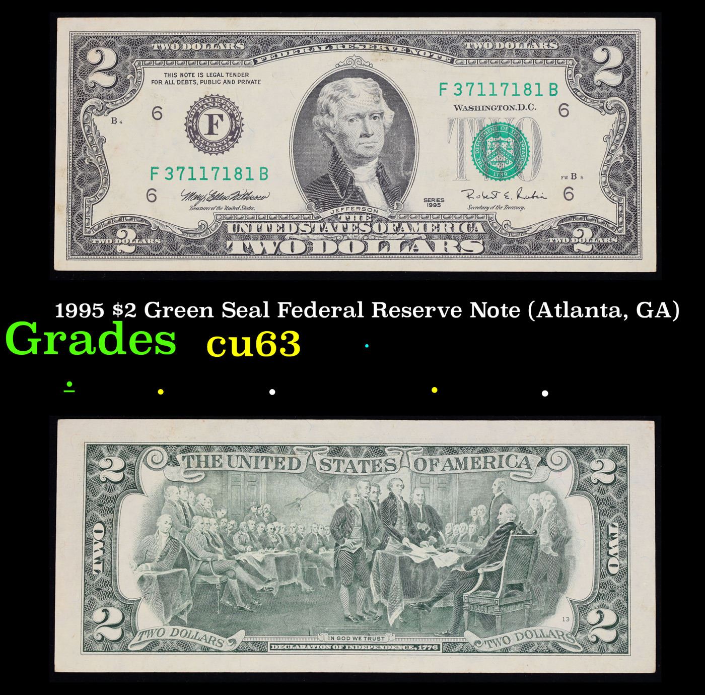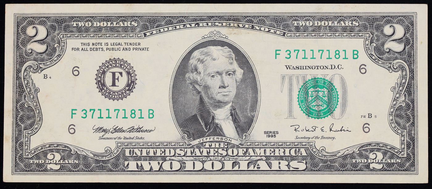 1995 $2 Green Seal Federal Reserve Note (Atlanta, GA) Grades Select CU
