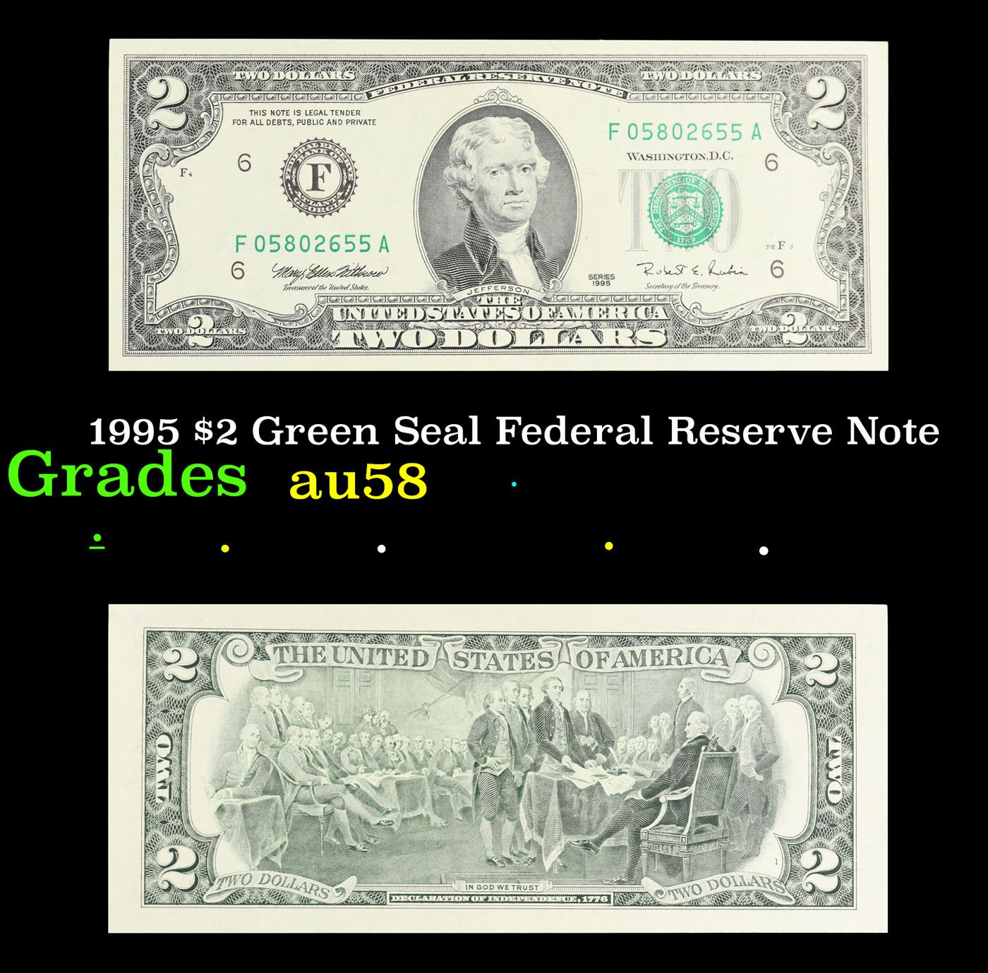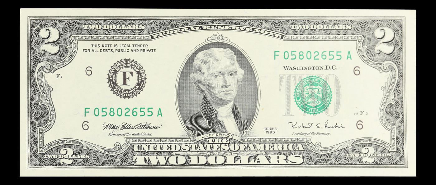 1995 $2 Green Seal Federal Reserve Note Grades Choice AU/BU Slider.