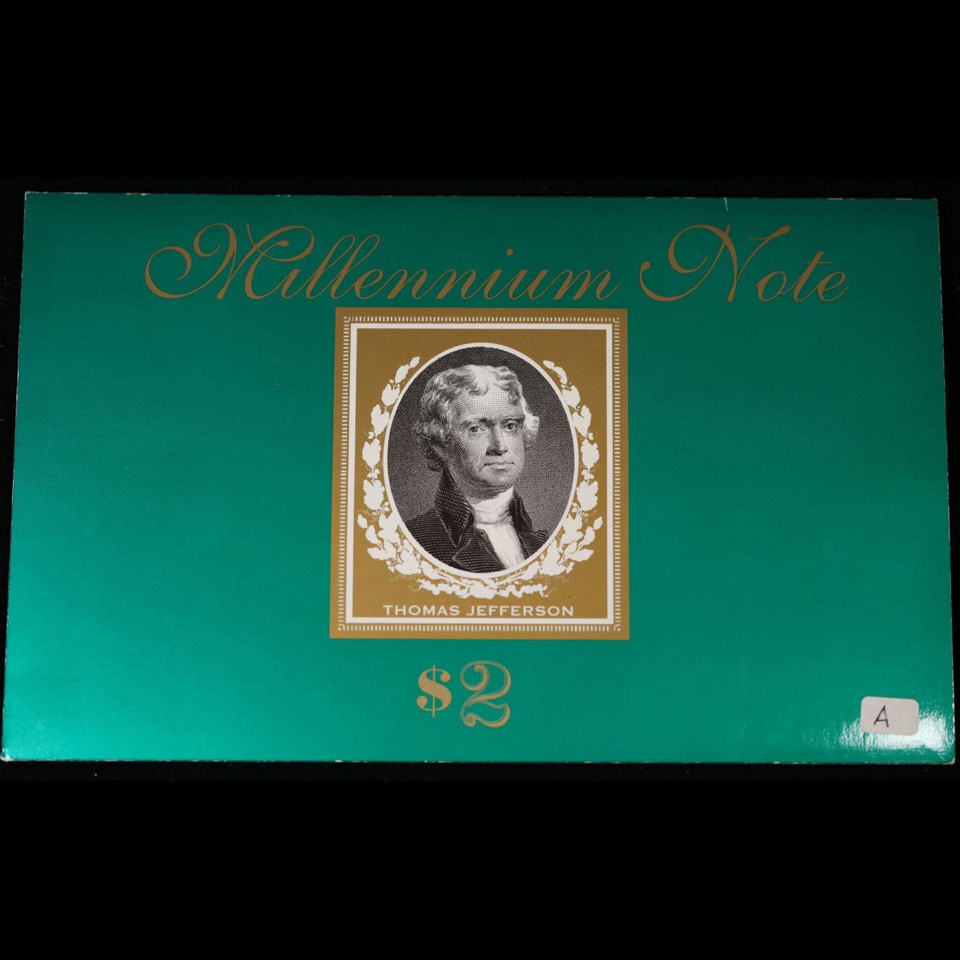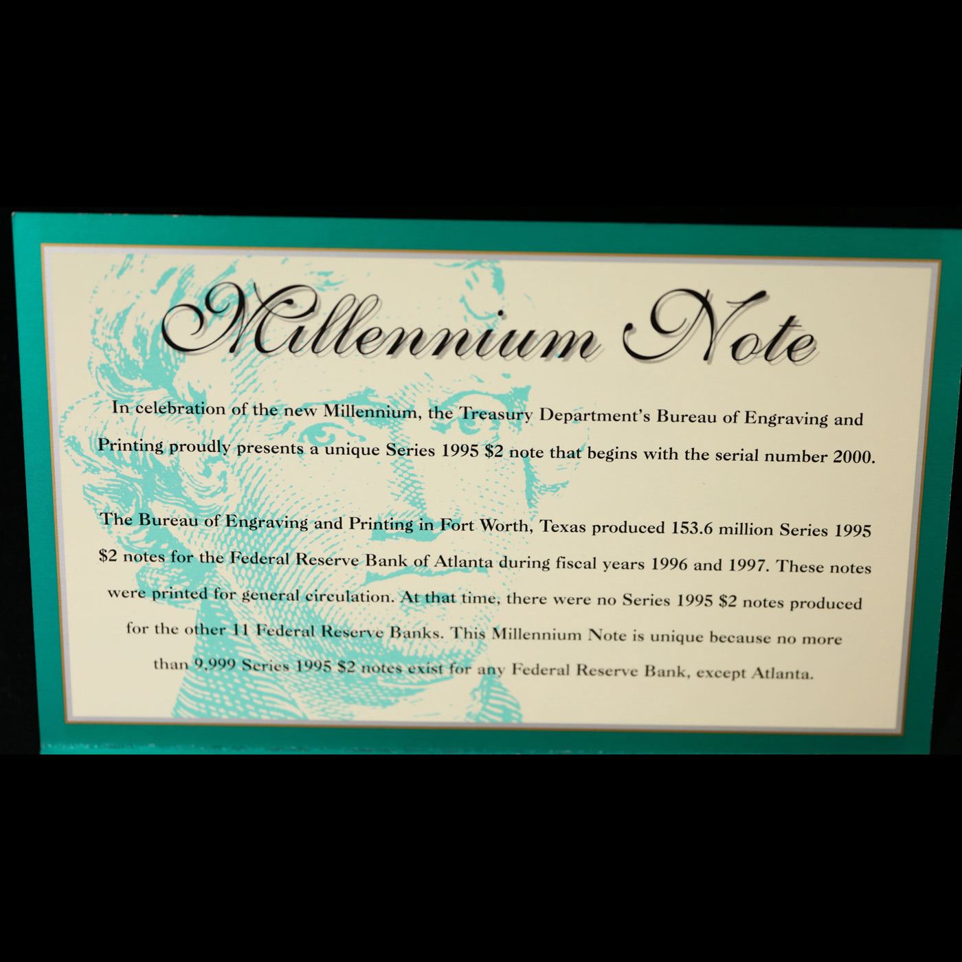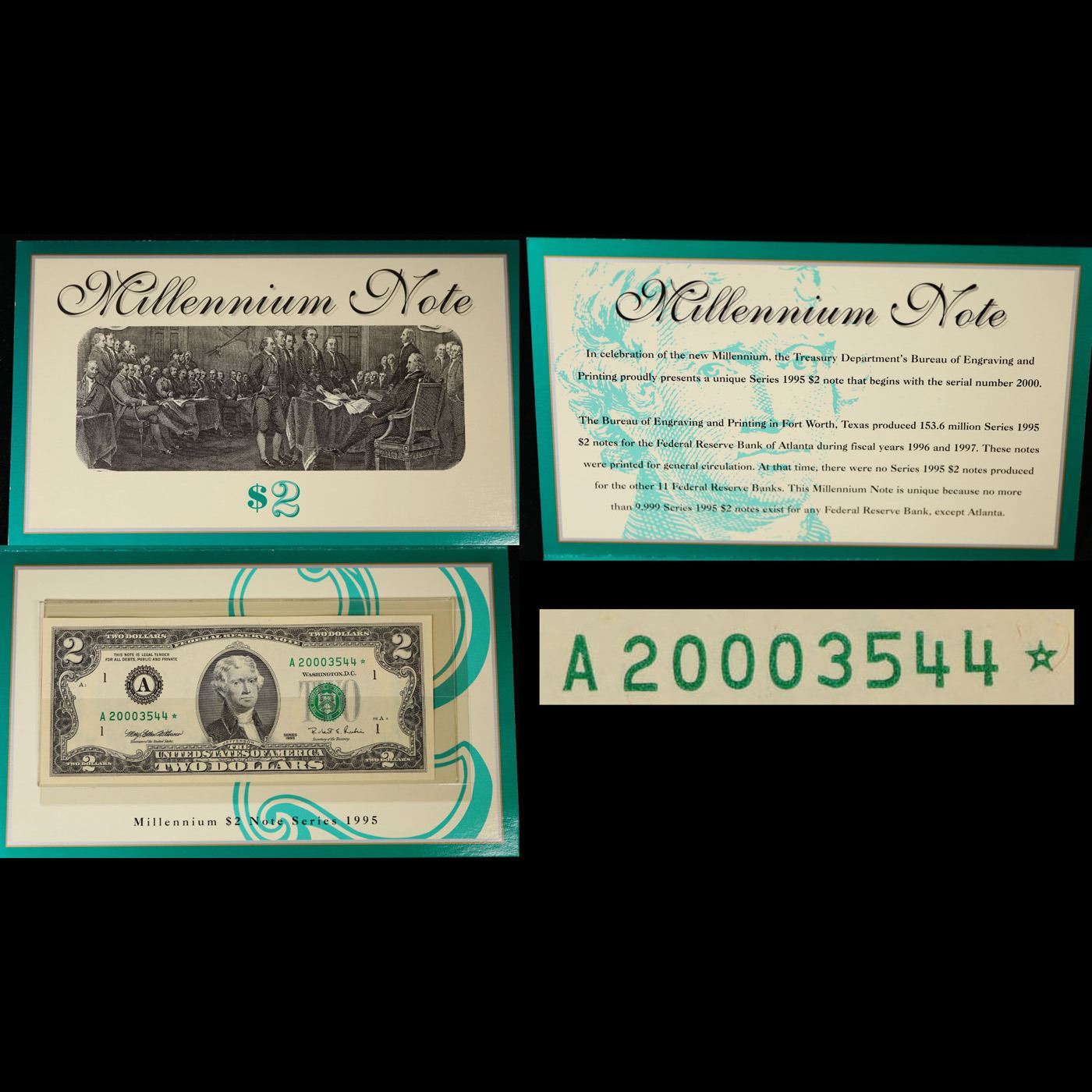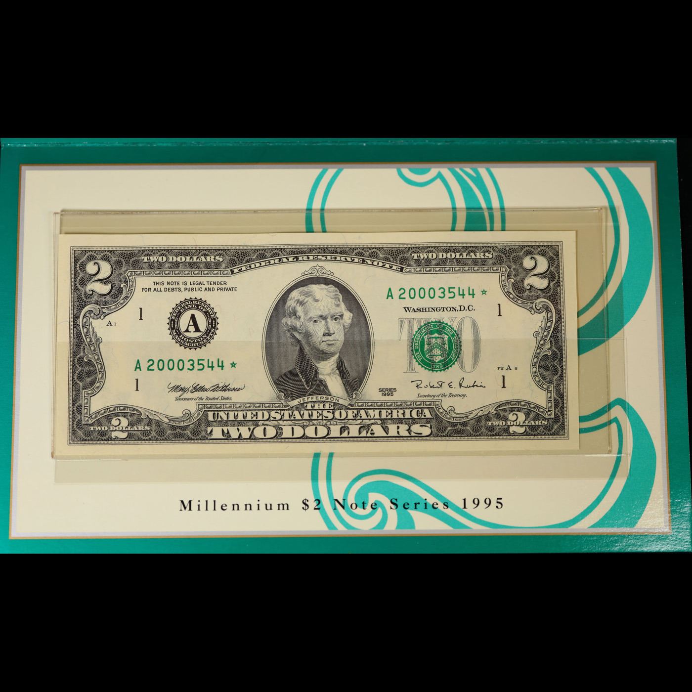 1995 $2 Green Seal Millennium Note Federal Reserve Note In Original Packaging Grades ng.