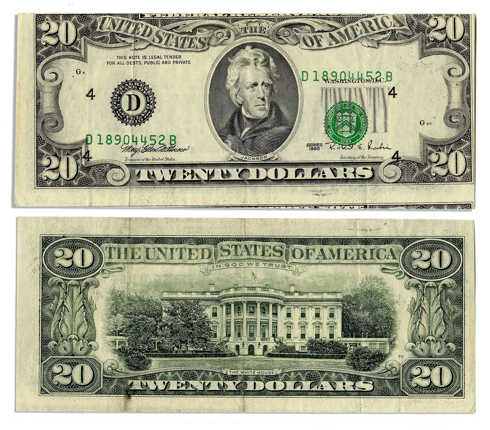 $20 Federal Reserve Error Note -- Series 1995, Cleveland -- Off-Set Printing: Two Bills Visible -- Serial Numbers Not Centered